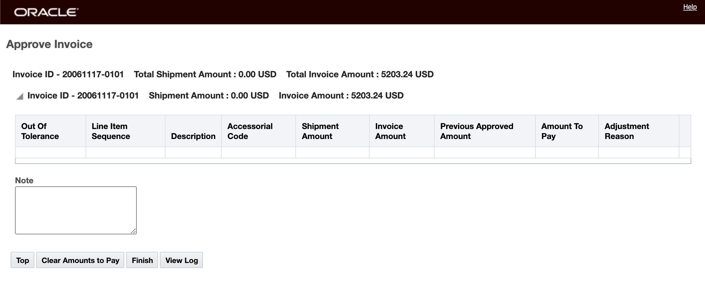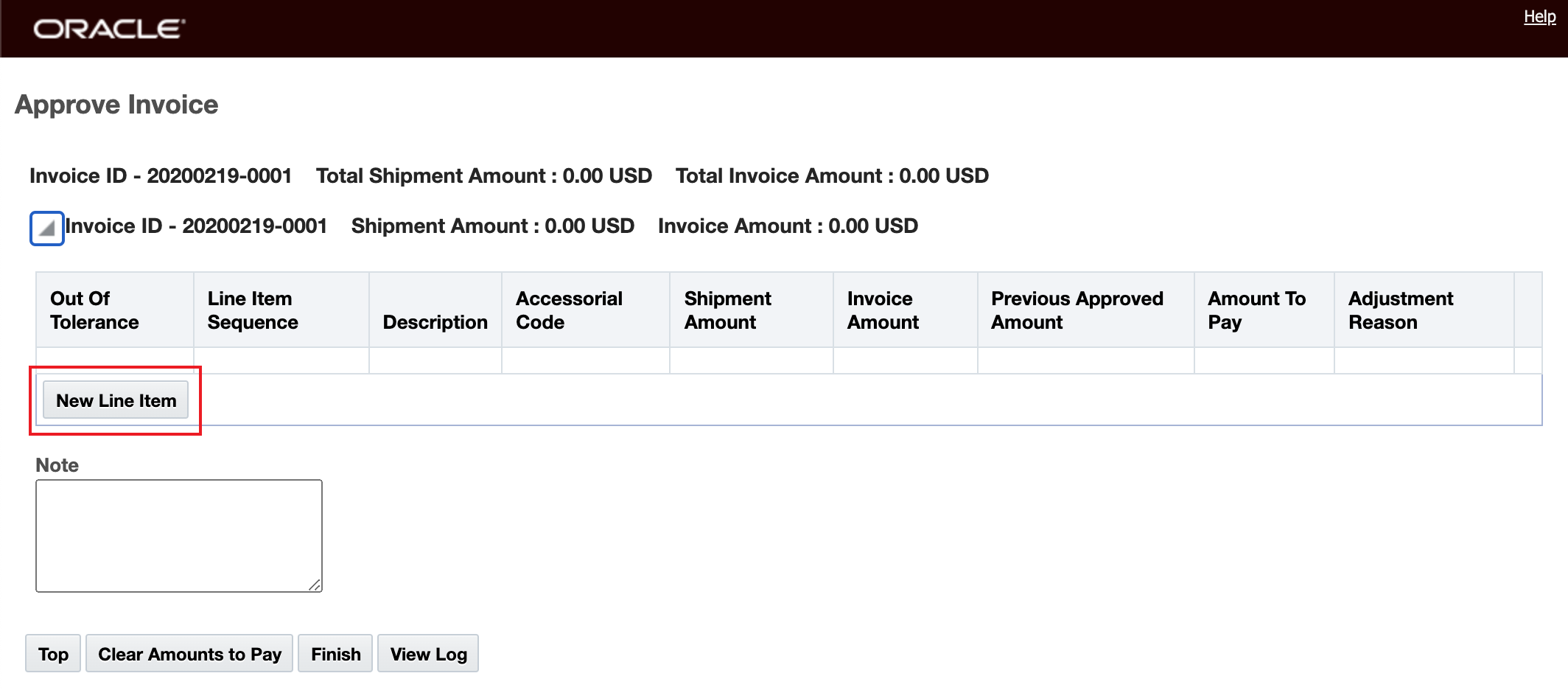 This feature provides you with a property - glog.invoice.manualApprove.disableAddNewInvoiceLineButton - which allows you to control whether to display or hide the New Invoice Line button when you run the Approve Invoice action. The default value for the the property is 'false' the New Invoice Line button is shown. To hide the New Line Item button the property should be set to 'true'.