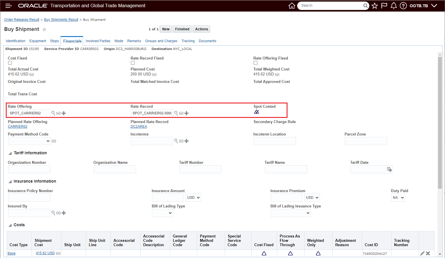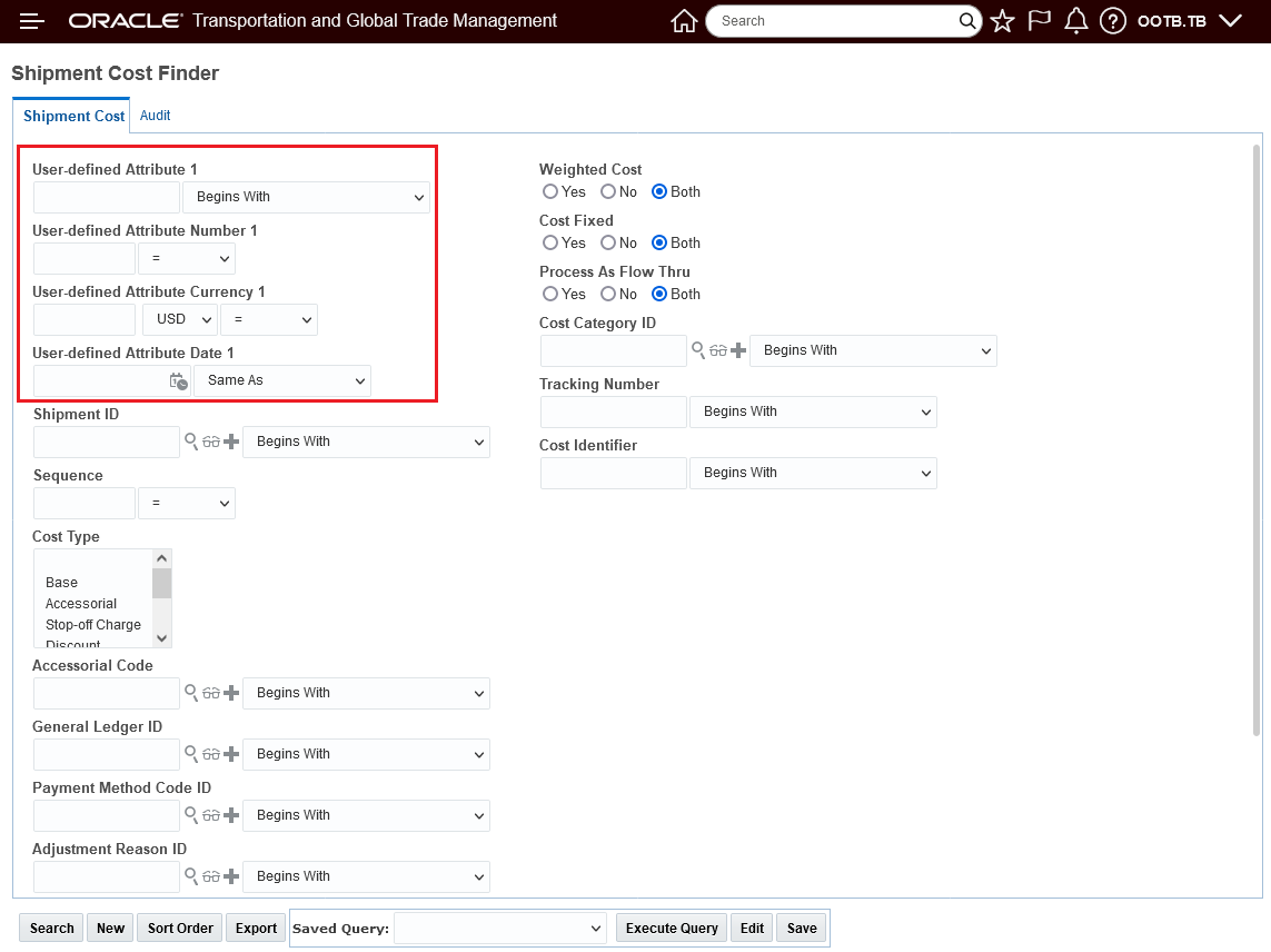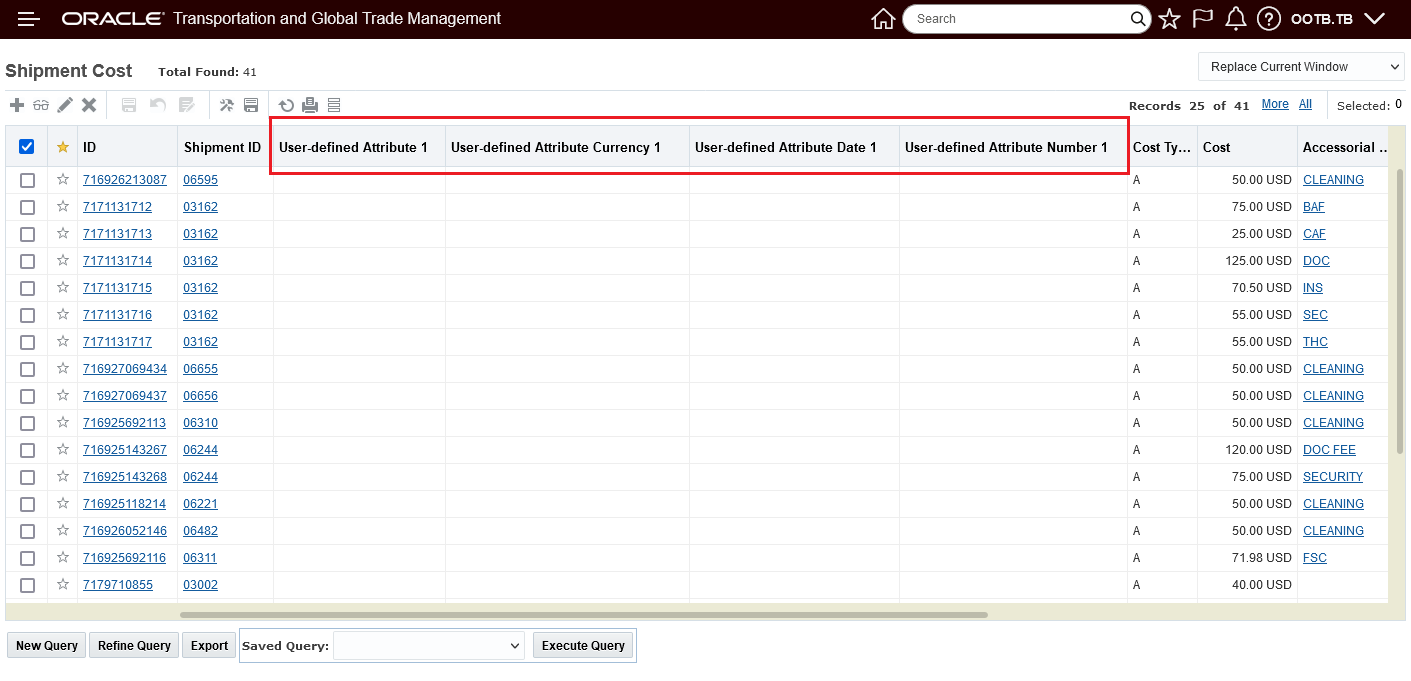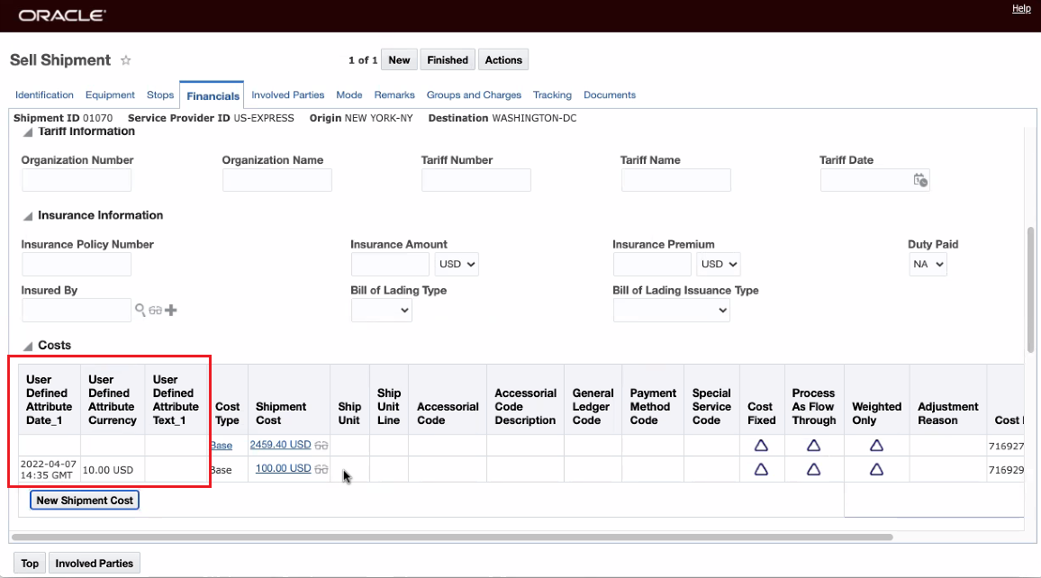 Shipment Cost User Defined Attributes Added to Shipment Manager Financials Tab