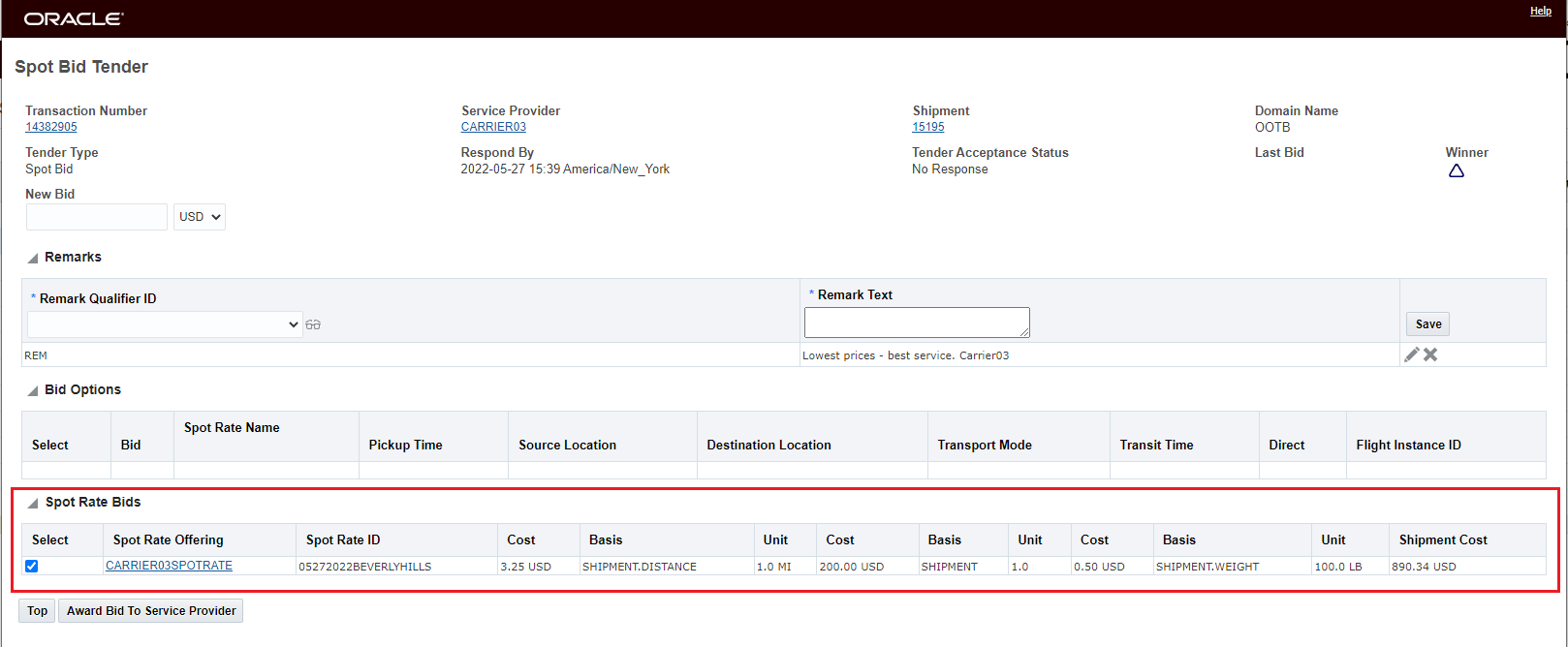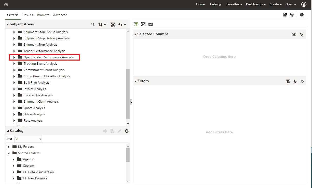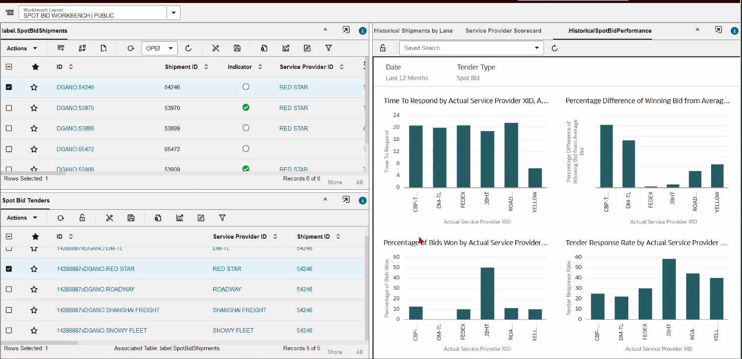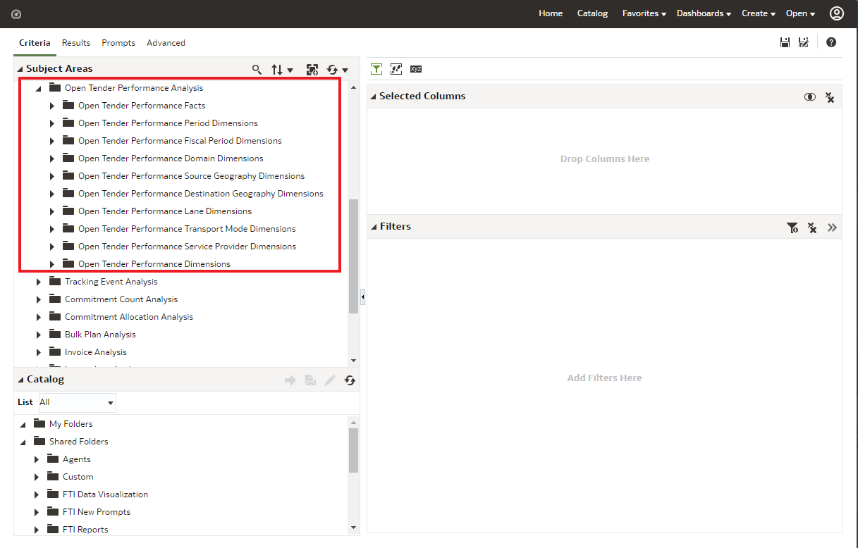 This feature provides you with a new Subject Area - Open Tender Performance - that provides you with all the facts and dimensions required to develop Reports and Dashboards to analyze your Open Tenders (Broadcast and Spot Bid Tender) Performance.
