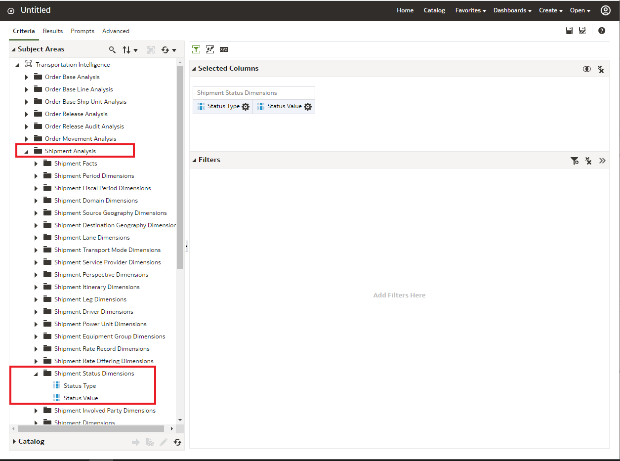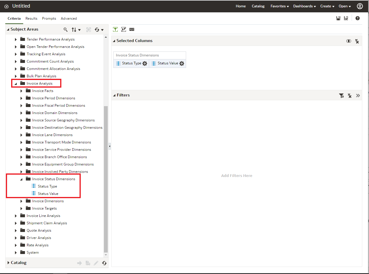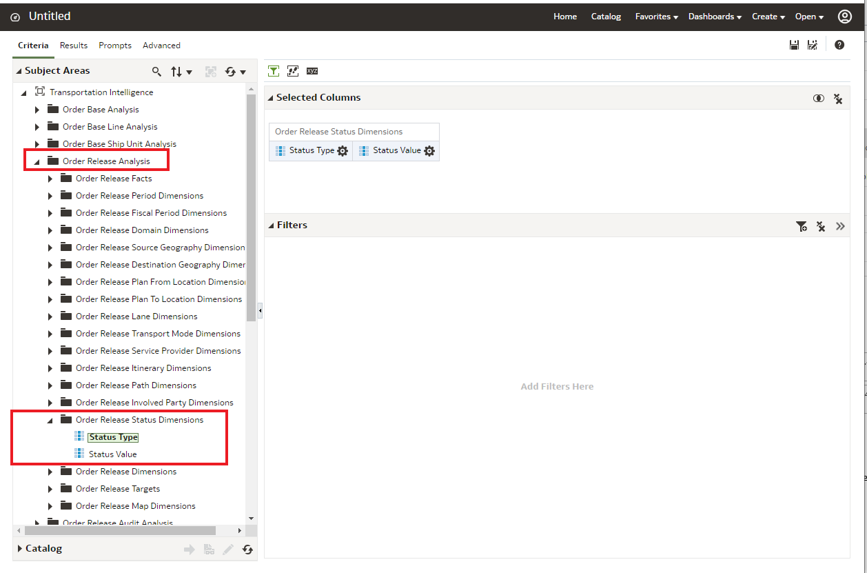 This feature provides you with new Status Dimensions folder for the Order Release, Shipment and Invoice. The new Status Dimensions Subject Area provides both Status Type and Status Value.