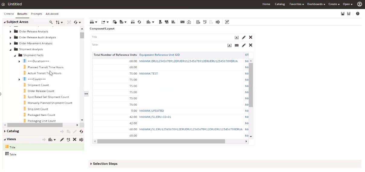 This feature extends the Shipment Facts and Dimensions provided to include additional Equipment Reference Unit insight. The Shipment Dimensions now includes the Equipment Reference Unit GID and Shipment Facts now includes the Total Number of Reference Units fact.