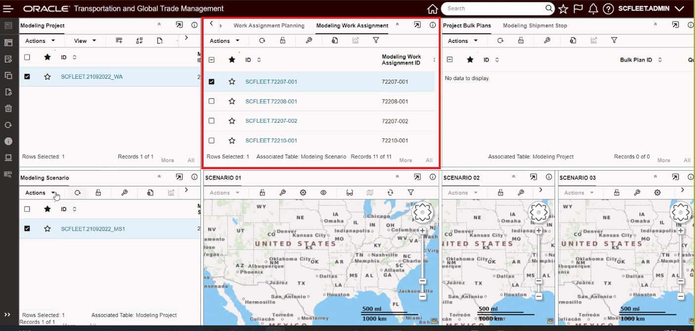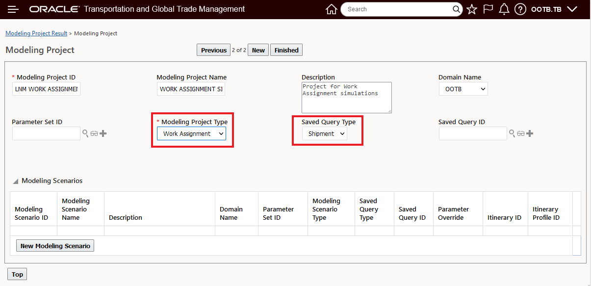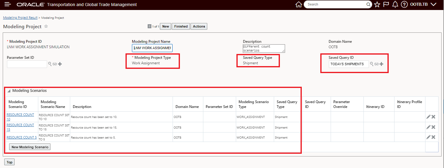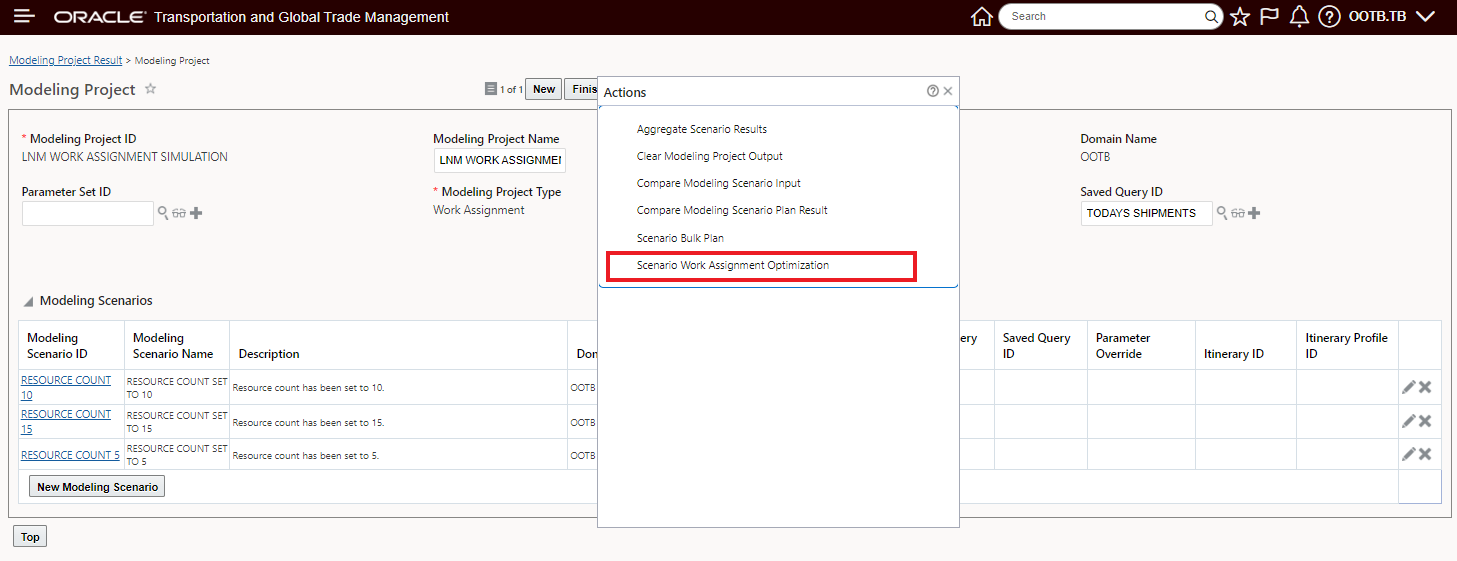 The Modeling Project and Modeling Scenario setup for a Work Assignment simulation using OTM Operational shipments is demonstrated below.