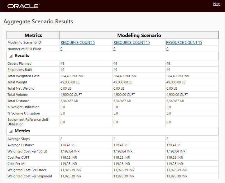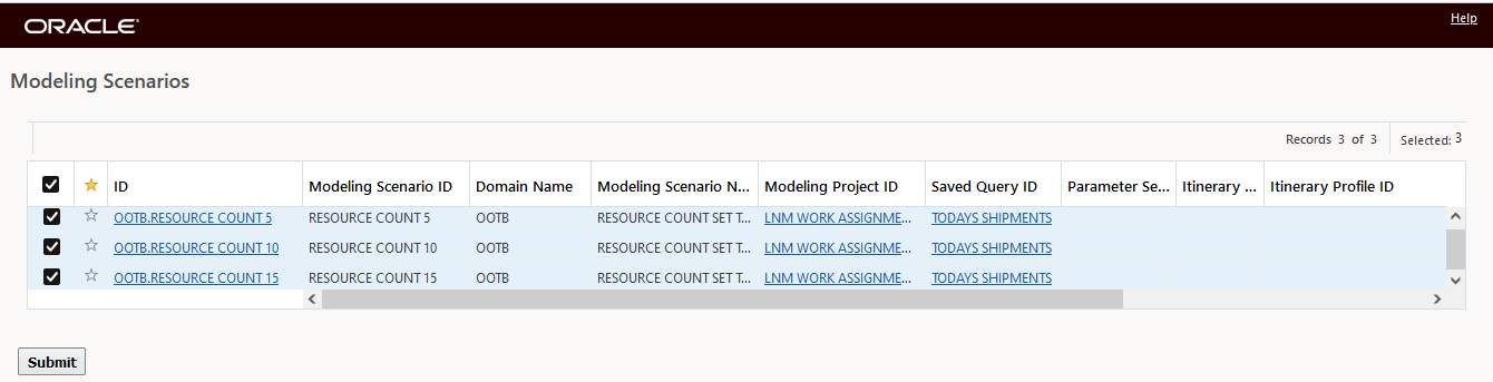 Once all the Modeling Scenarios are defined - the Modeling Project is complete for this simulation. For this Work Assignment Modeling Project, there are three Modeling Scenarios with varying Resource Counts. Each scenario will all be run using the OTM operational shipments returned by the Shipment Saved Query TODAYS SHIPMENTS - the goal is to generate Work Assignments for the shipments considering the different Resource Counts.