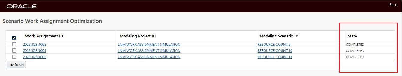 .While the simulations are running, you have visibility to the Modeling Scenarios and the current Scenario Work Assignment Optimization state.