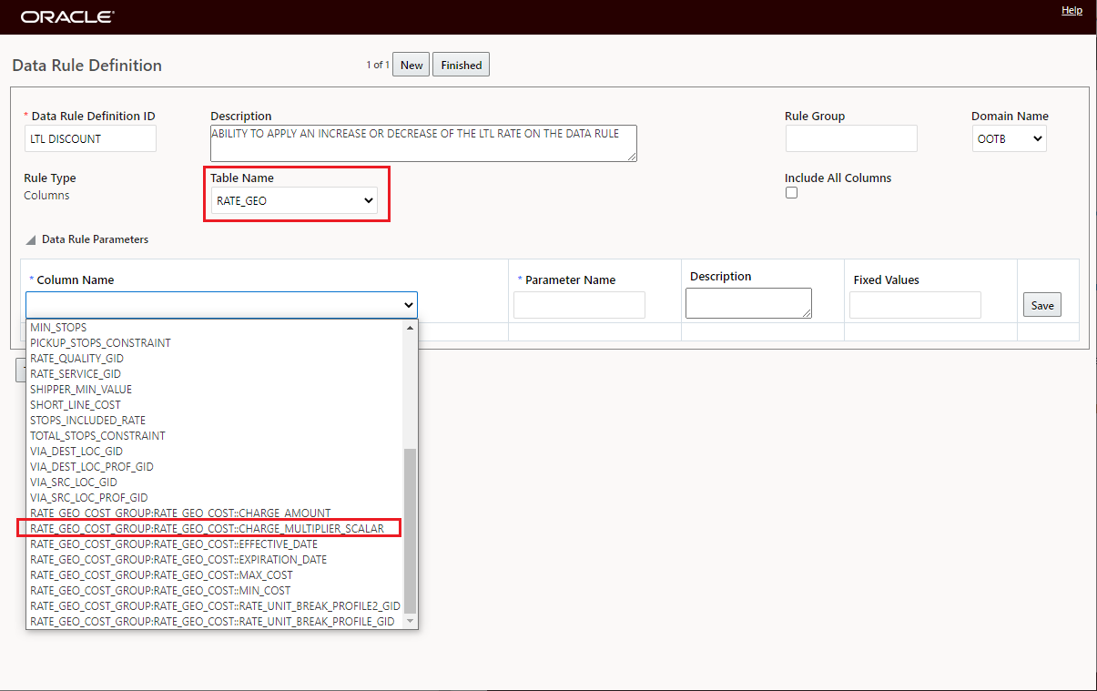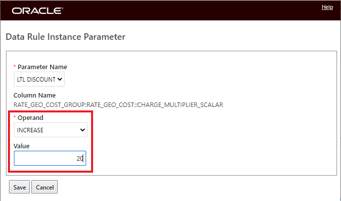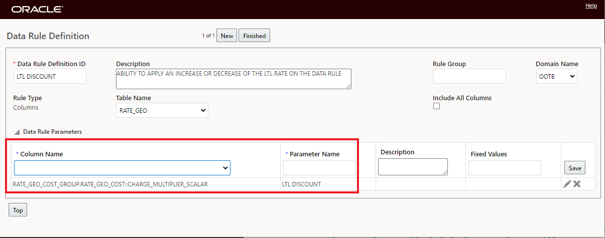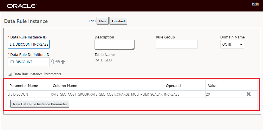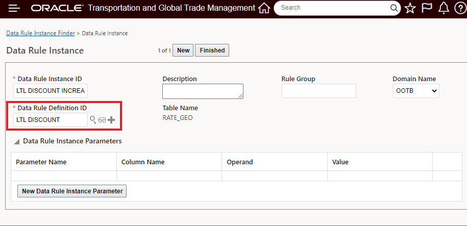 In the example below, the Data Rule Definition is configured to allow for you to input, on a Data Rule Instance, the desire LTL Discount.
