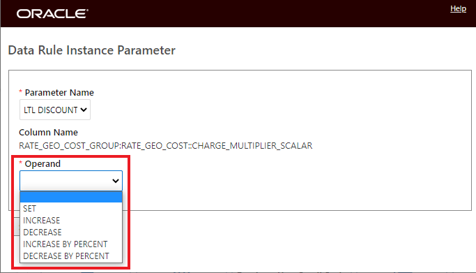 The Data Rule Parameter input for the Data Rule Instance provides five options for the Operand - SET, INCREASE, DECREASE, INCREASE BY PERCENT, and DECREASE BY PERCENT.