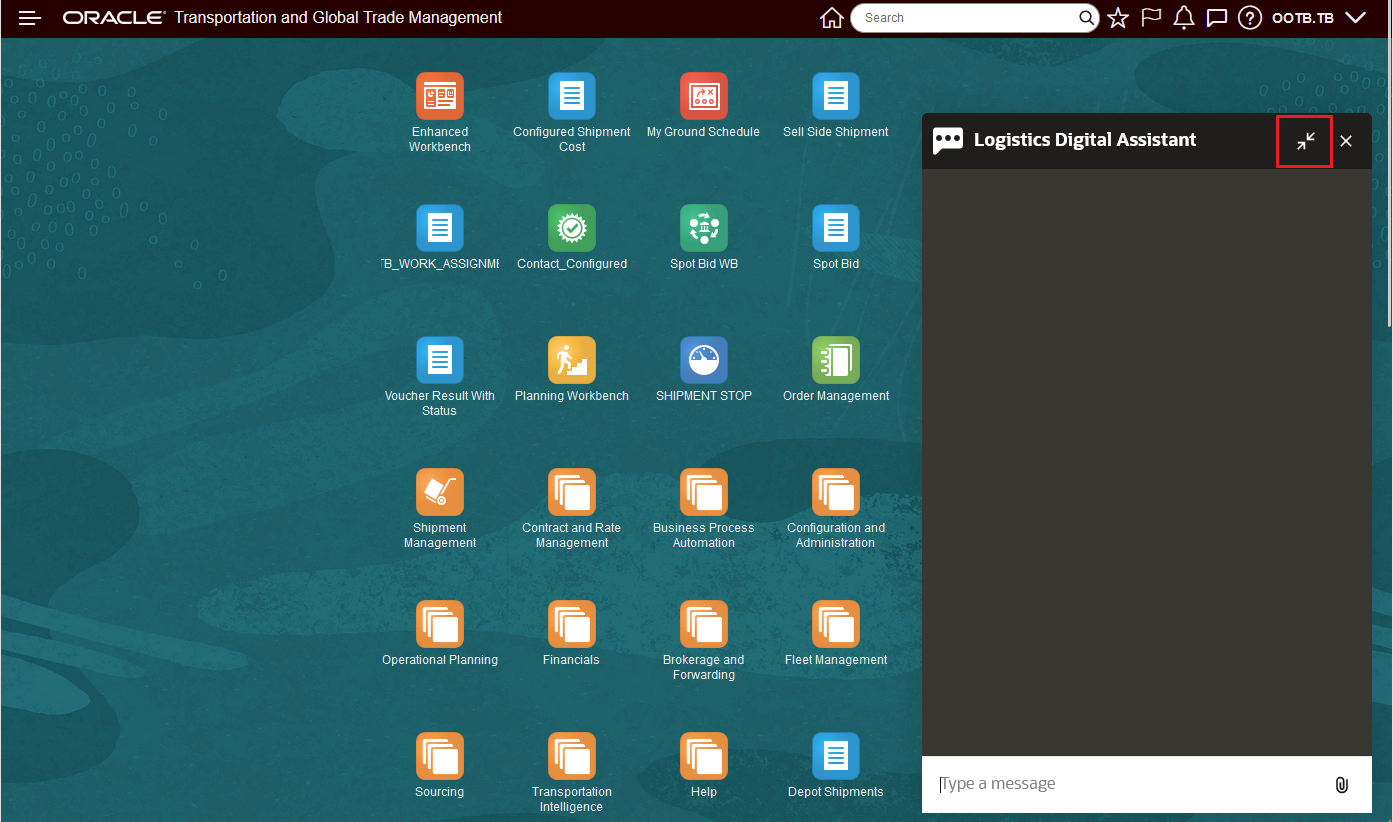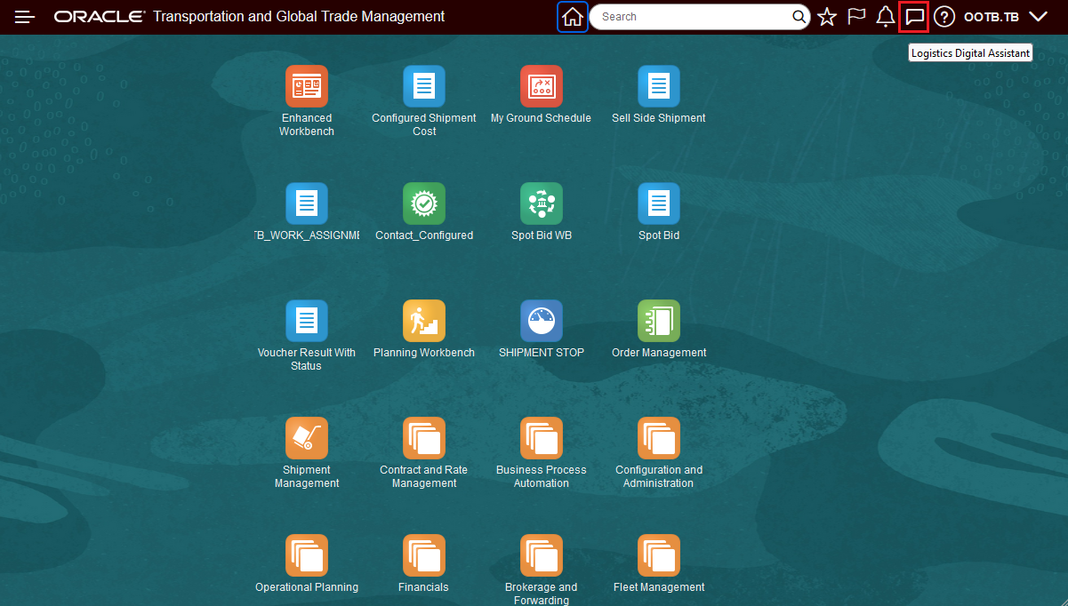 Once configured, you can bring up the Logistics Digital Assistant by selecting the Logistics Digital Assistant icon from the Global Header - as shown below.