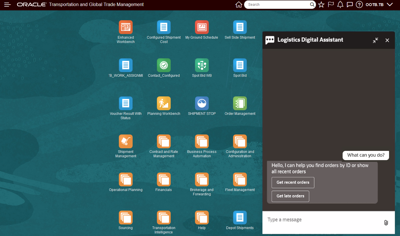 The Logistics Digital Assistant (LDA) is enabled through the use of Oracle's digital assistant platform, Oracle Digital Assistant (ODA), which provides the tools and capabilities you need to build AI-powered assistants with task-specific skills, like the OTM Order/Shipment Status skill.