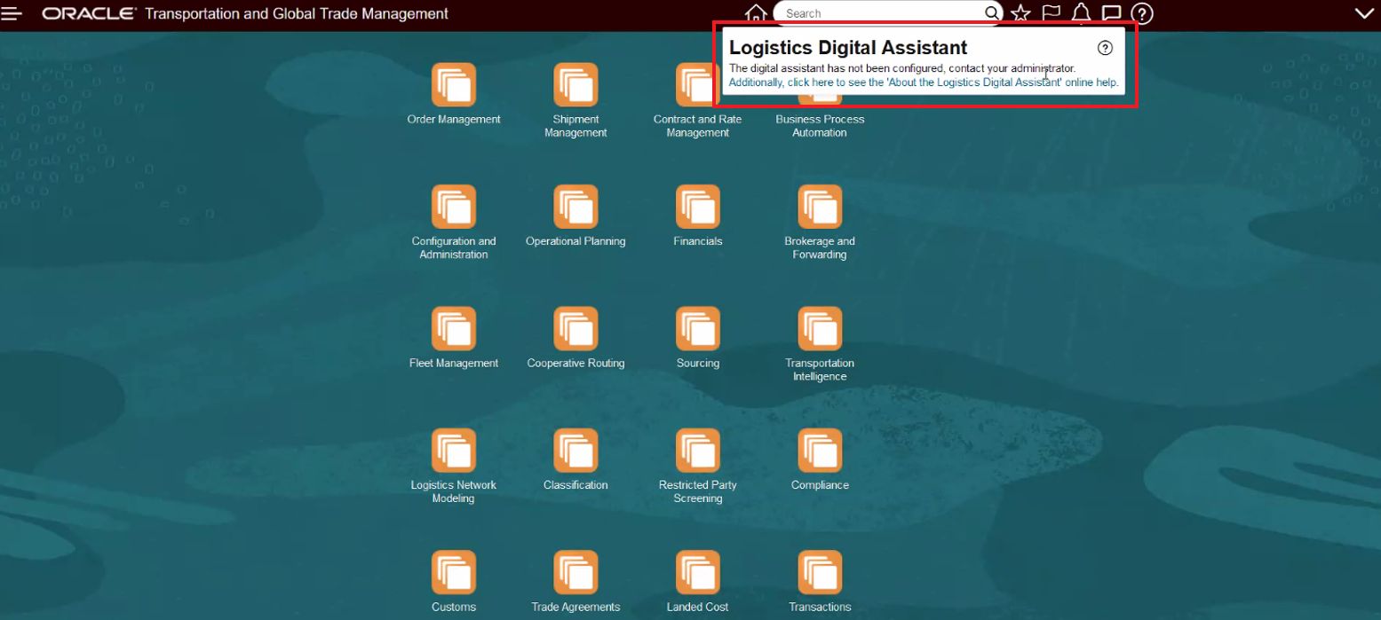 NOTE: If there is a problem with the setup - the error message below - with a link to Logistics Digital Assistant Help will be displayed.