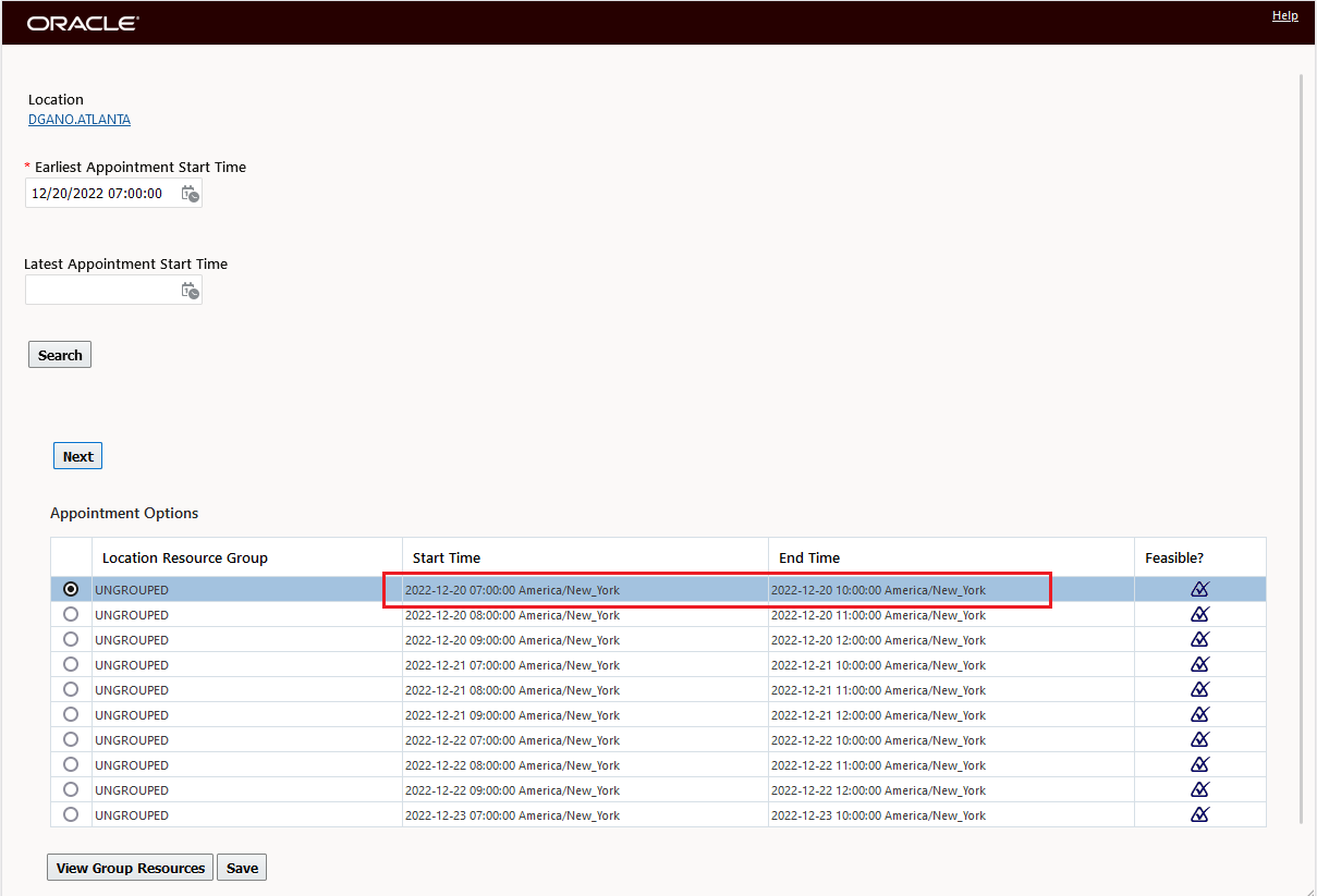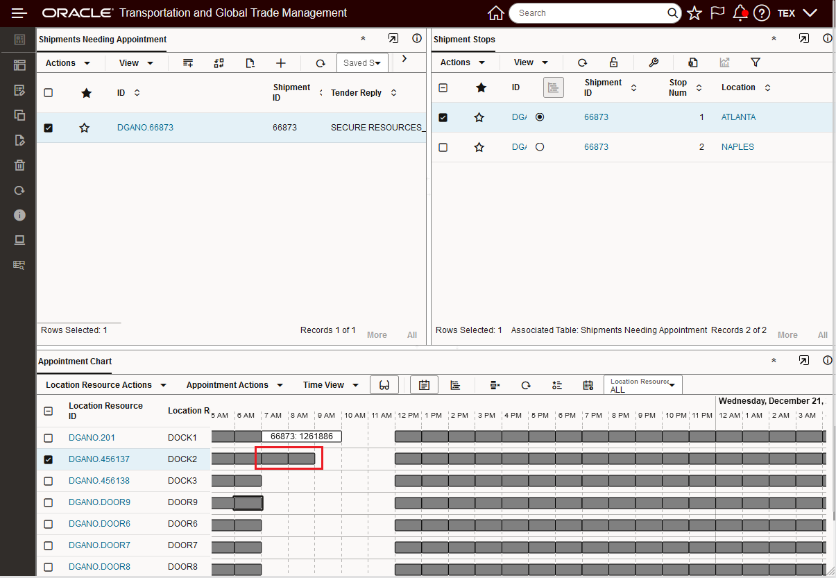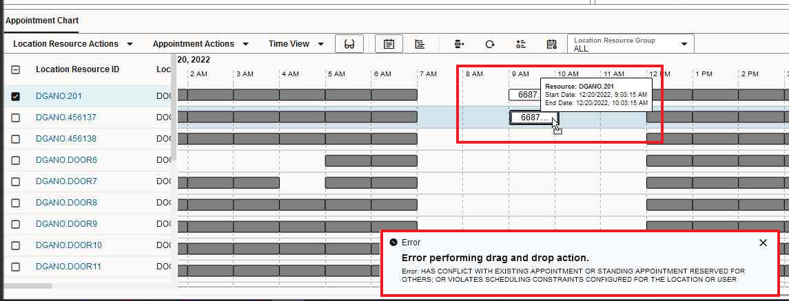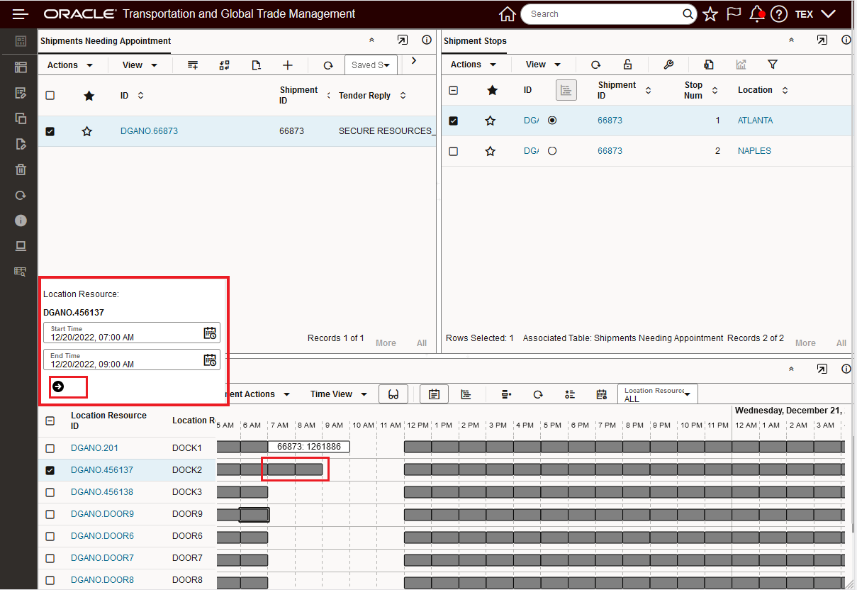 This feature will refocus the Gantt to show the time range related to the result of action being run. In the example below, the initial focus is on Wednesday December 21st and Thursday December 22. In this example, an appointment will be scheduled for the 20th and the Gantt will automatically refocus to the slot where the appointment has been scheduled.