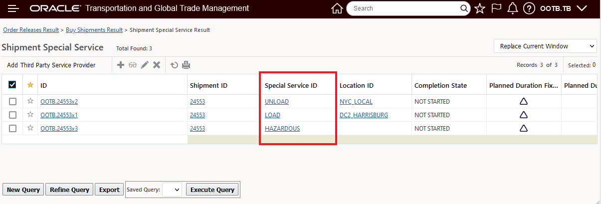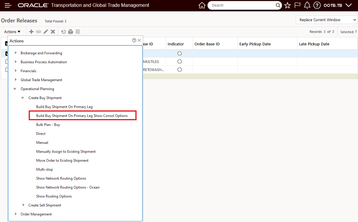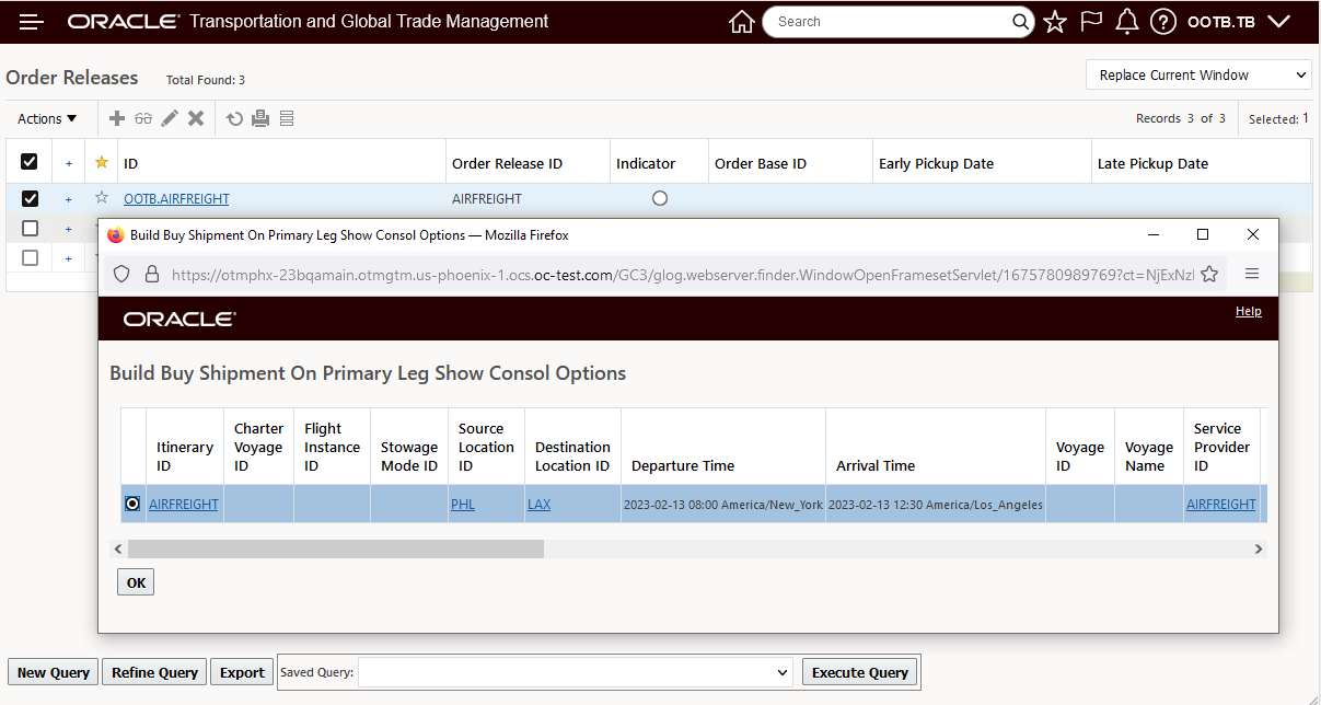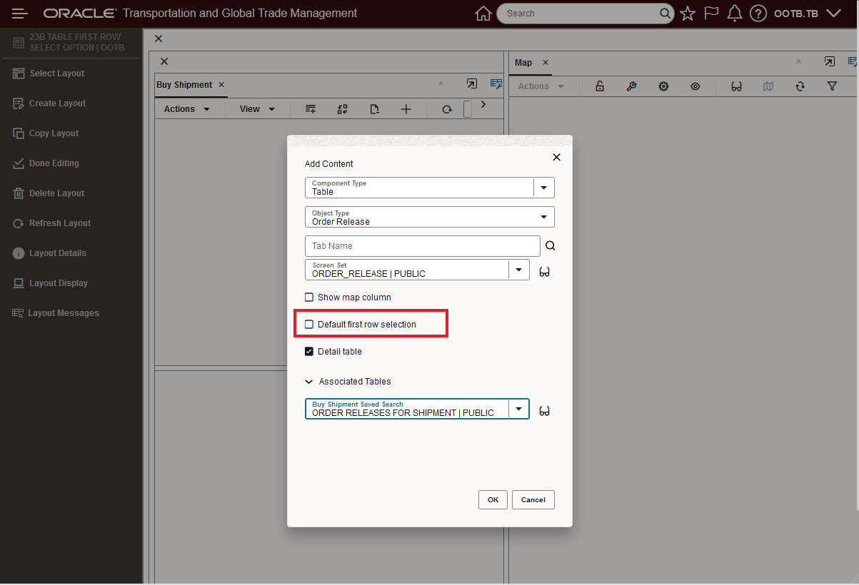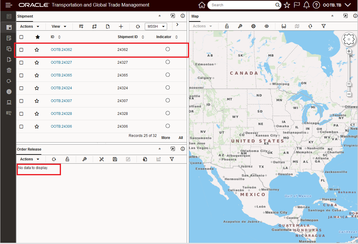 When the Enhanced Workbench with the Table Details configured above is opened, note that the first record in the Parent Table is not selected. Also note that since the first record is not selected no records are displayed in the related Order Release child table.