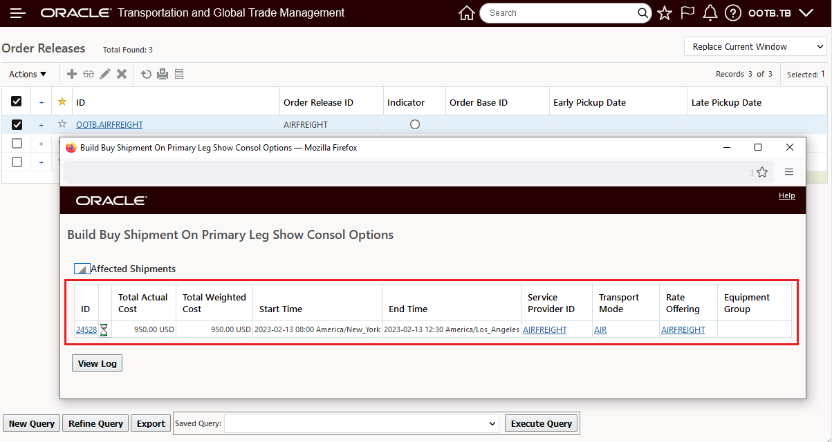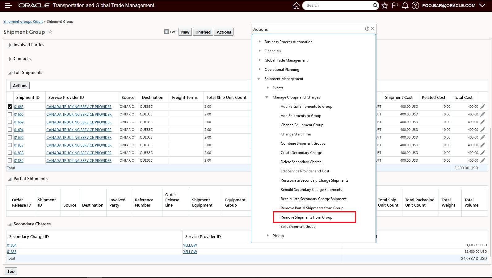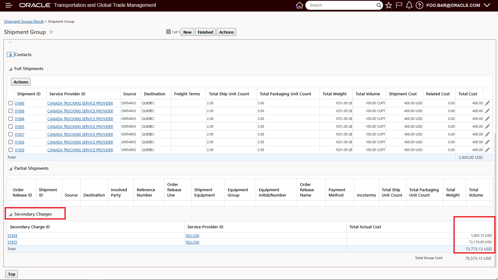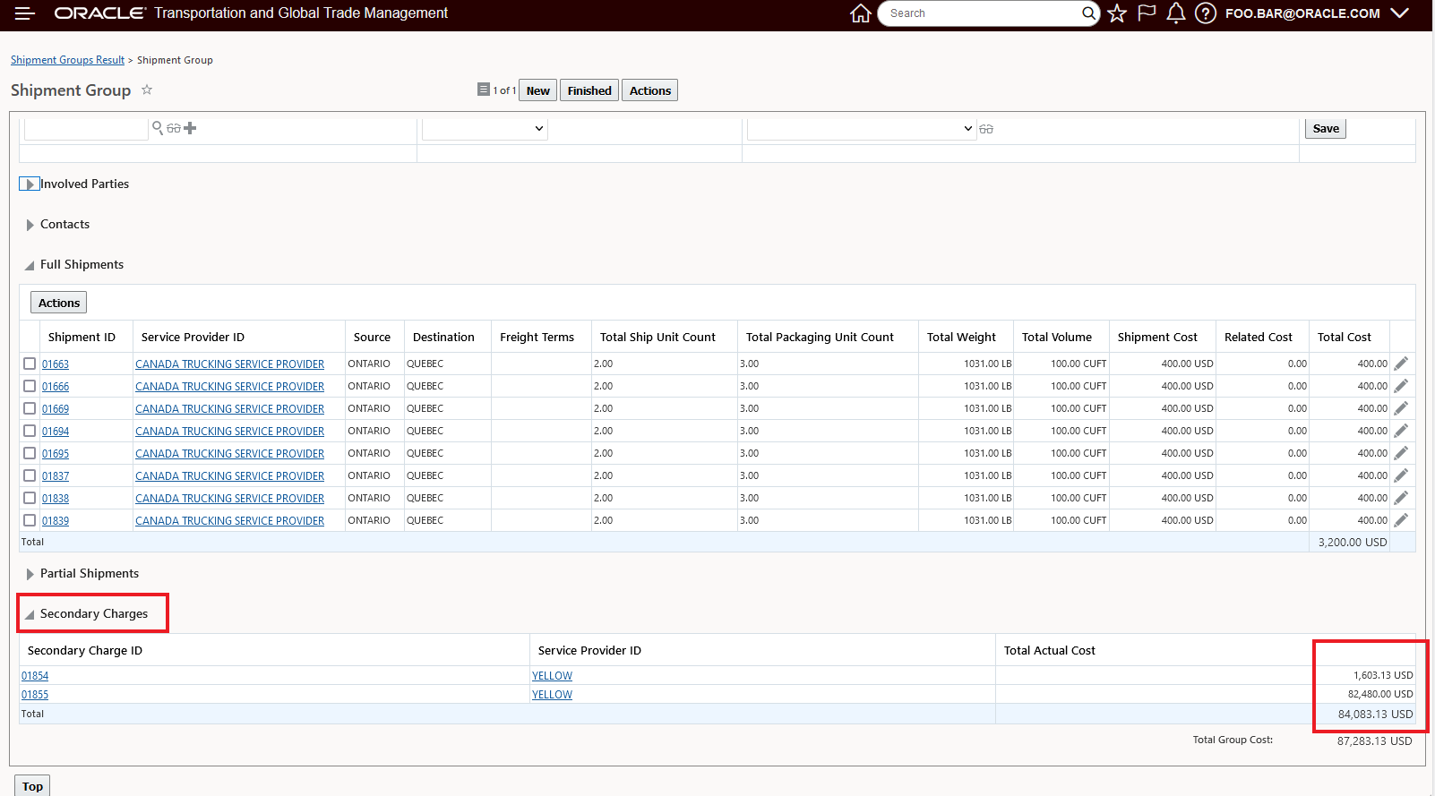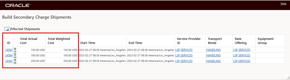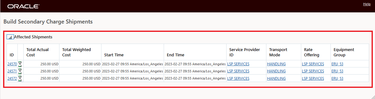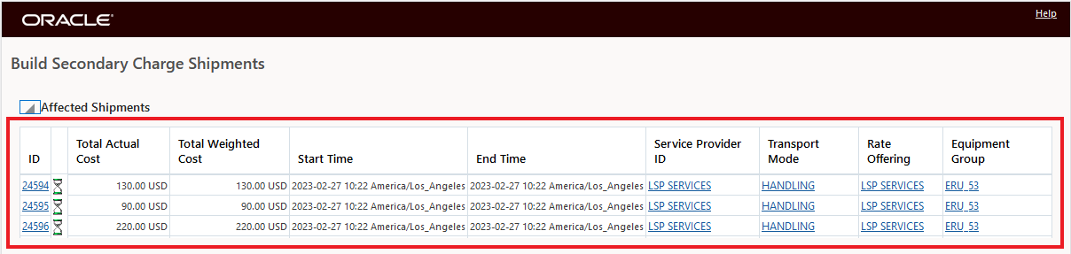 The result is below, as expected three secondary charge shipments are created. One secondary charge shipment for the Planned Picked Up quantity of 25 shipment units - 250.00 USD (10.00 USD per Ship Unit) then two additional Secondary Charge Shipments for the two Planned Received Stops - one stop for 10 ship units 100.00 USD and the other stop for 15 ship units for a total cost of 150.00 USD.