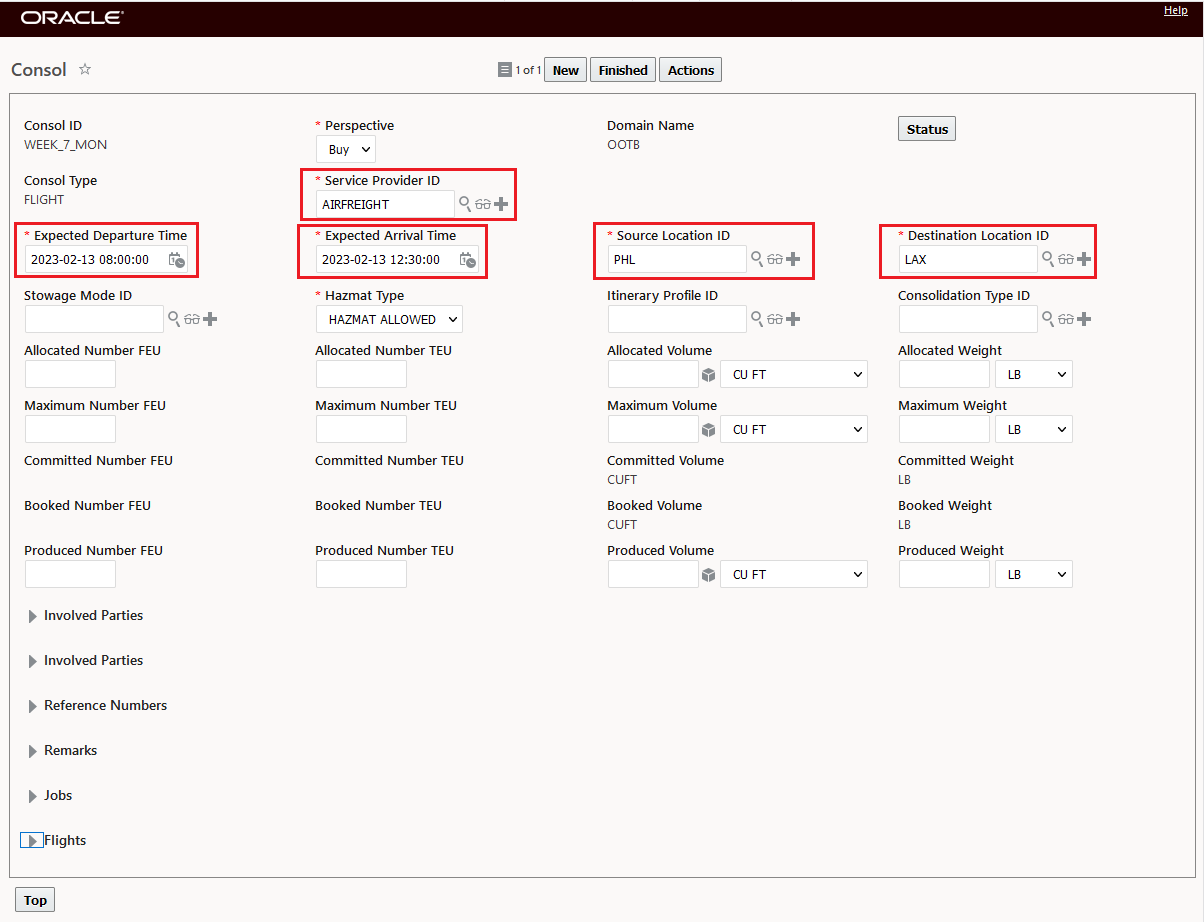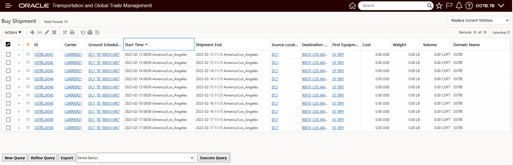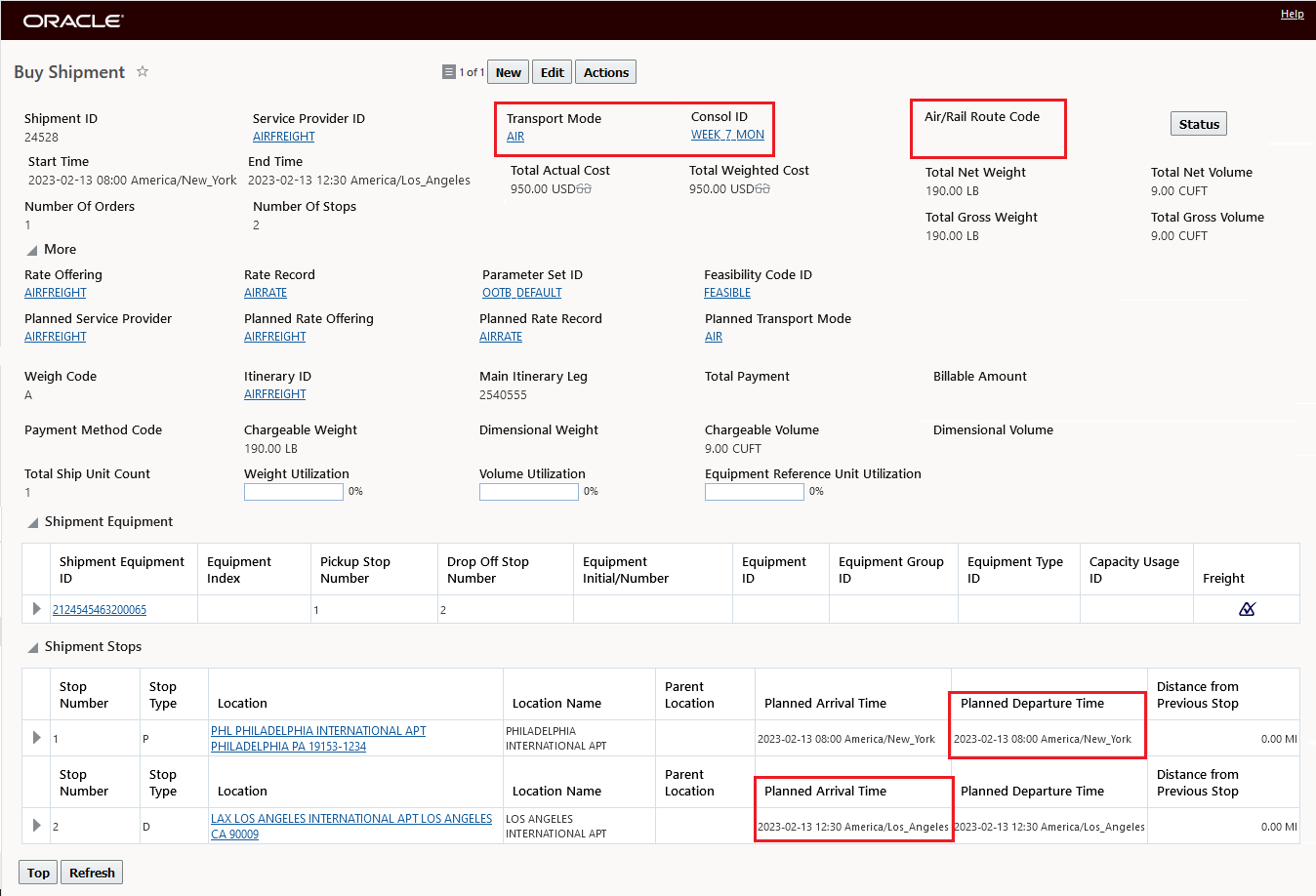 When the Build Secondary Charge Shipments action is run - with the Quantity Type option of Planned Received selected - only the Secondary Charge Shipment below is created for the 10 planned Ship Units delivering/received at the 90210 Los Angeles stop location.