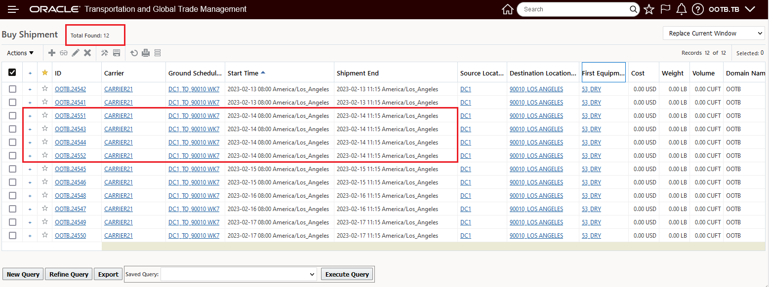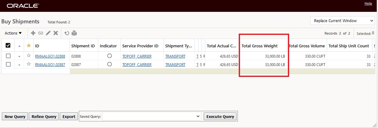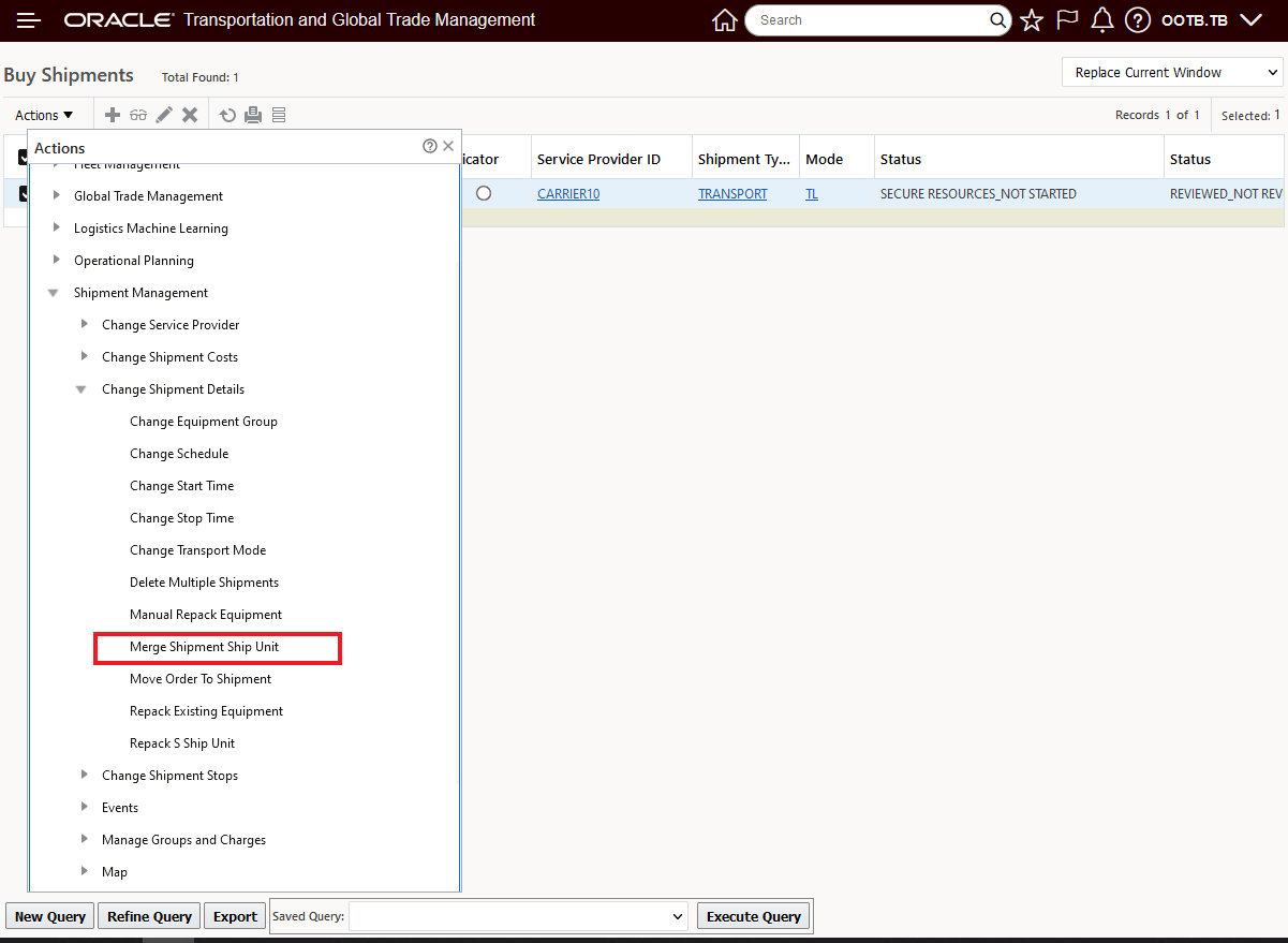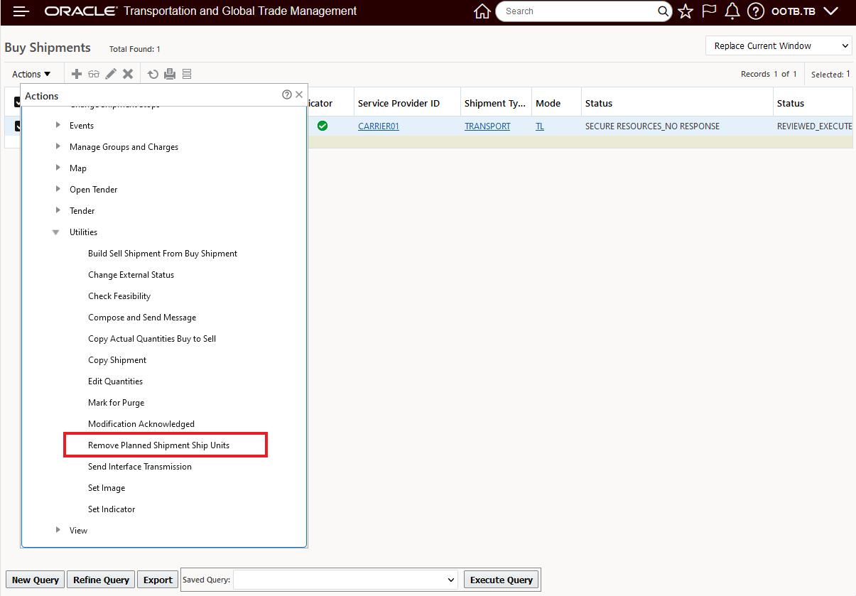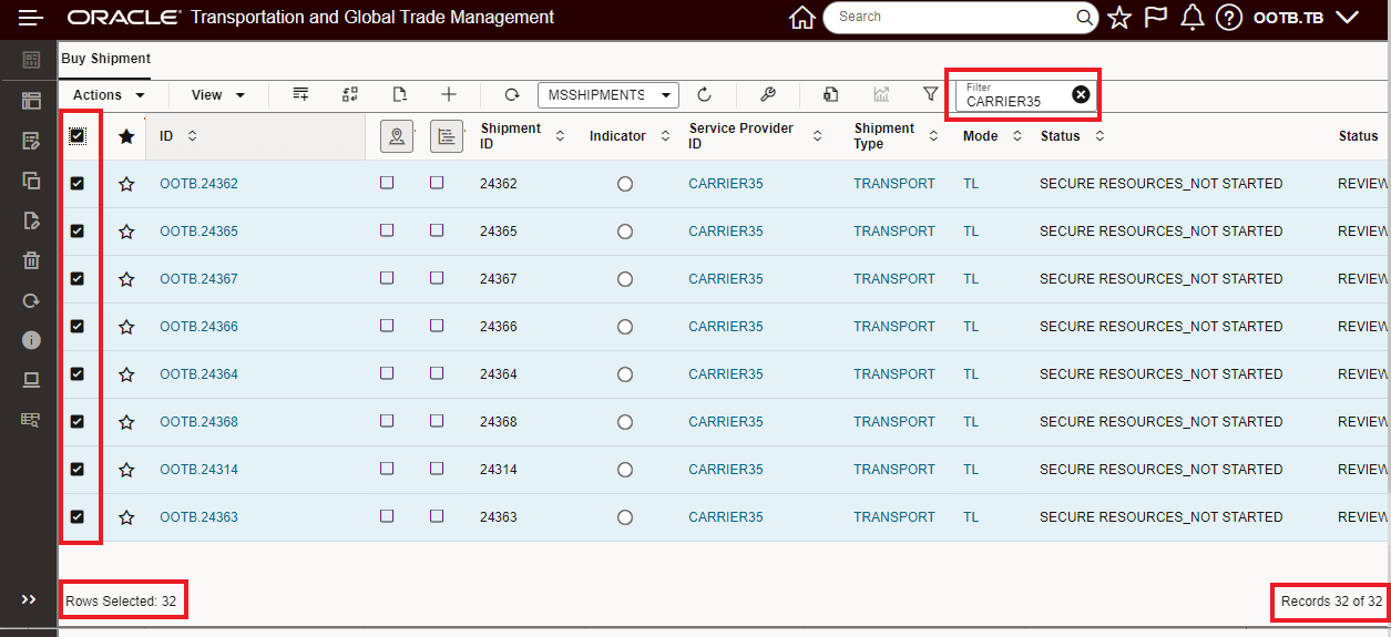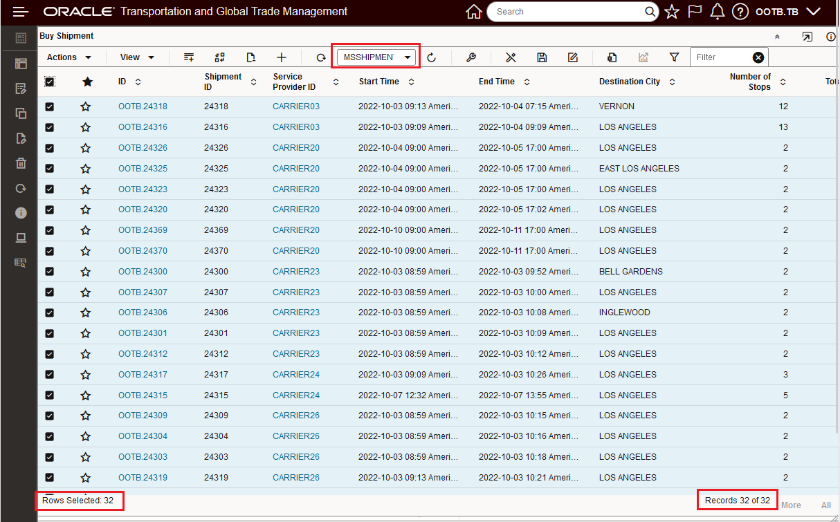 In the example below, the total shipments returned by the saved query (MSSHIPMENT) is 32, when the table is filtered to the text string CARRIER35 there are only 8 rows that meet that filtered criteria. When you now Select All in the filtered view - only the 8 filtered records are selected and will be acted on. To demonstrate the change, the Export action is used in the example below.