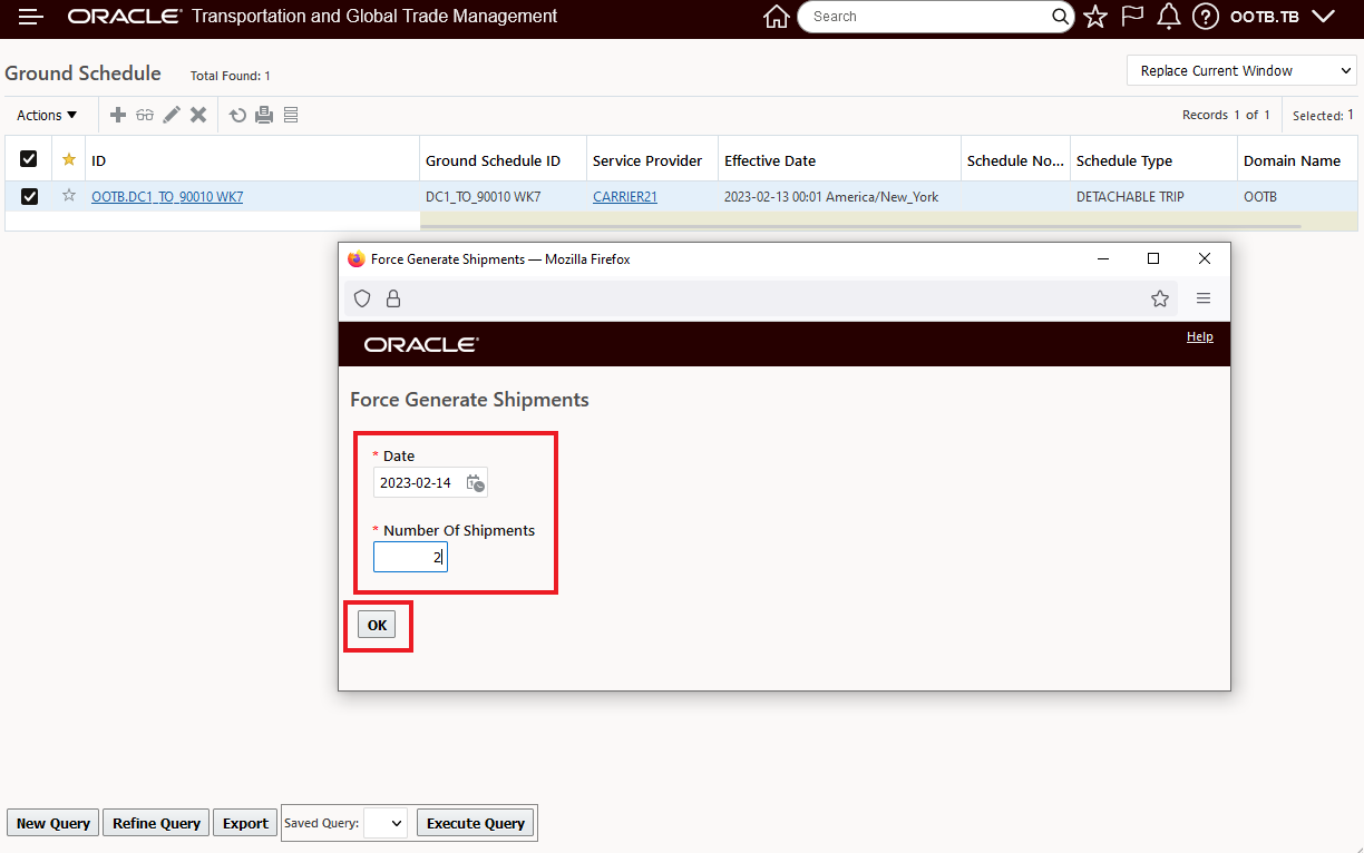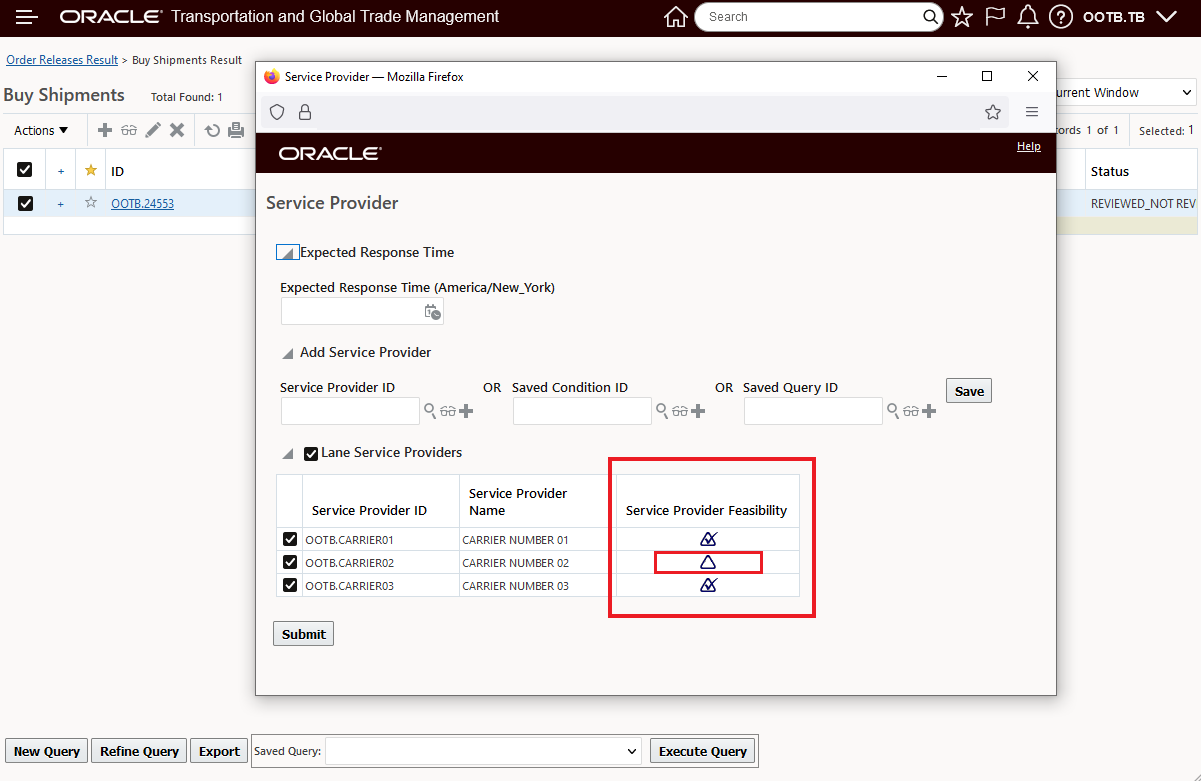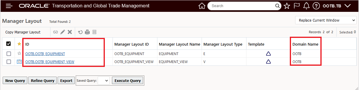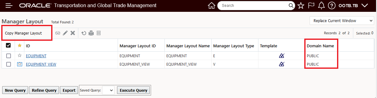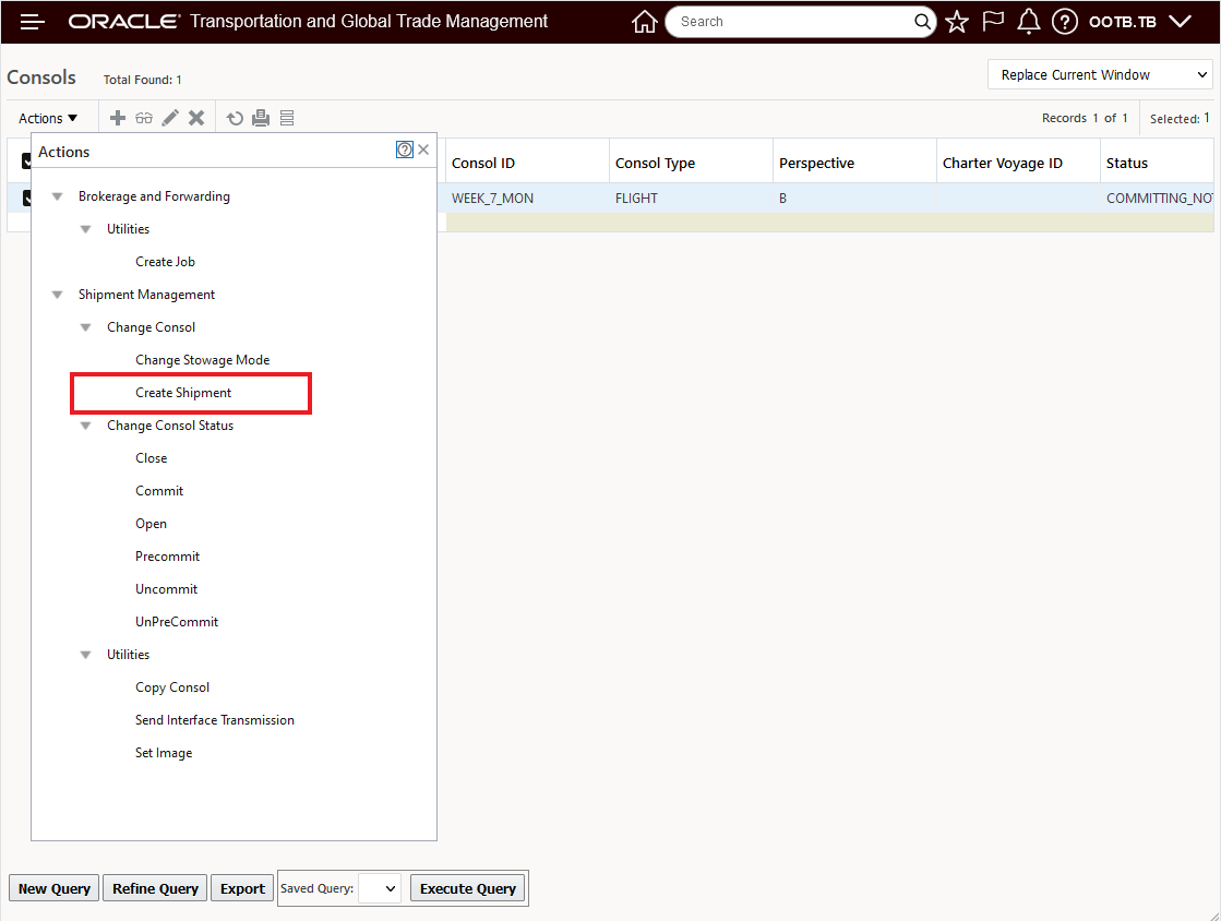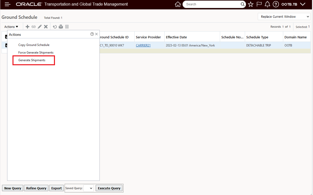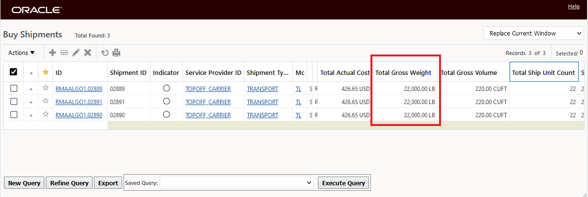 In the example below, the total shipments returned by the saved query (MSSHIPMENT) is 32, when the table is filtered to the text string CARRIER35 there are only 8 rows that meet that filtered criteria. When you now Select All in the filtered view - only the 8 filtered records are selected and will be acted on. To demonstrate the change, the Export action is used in the example below.