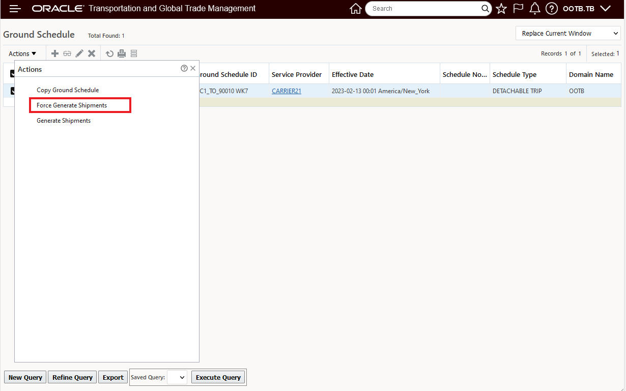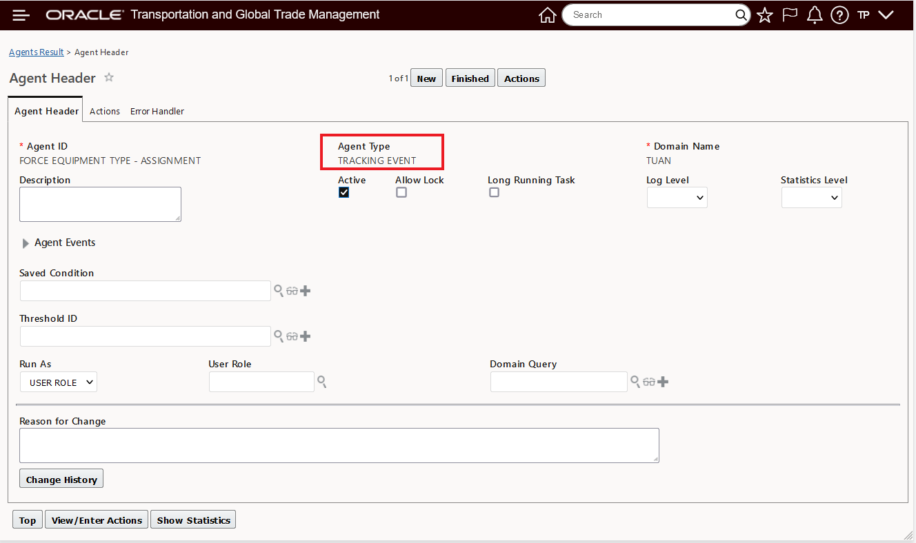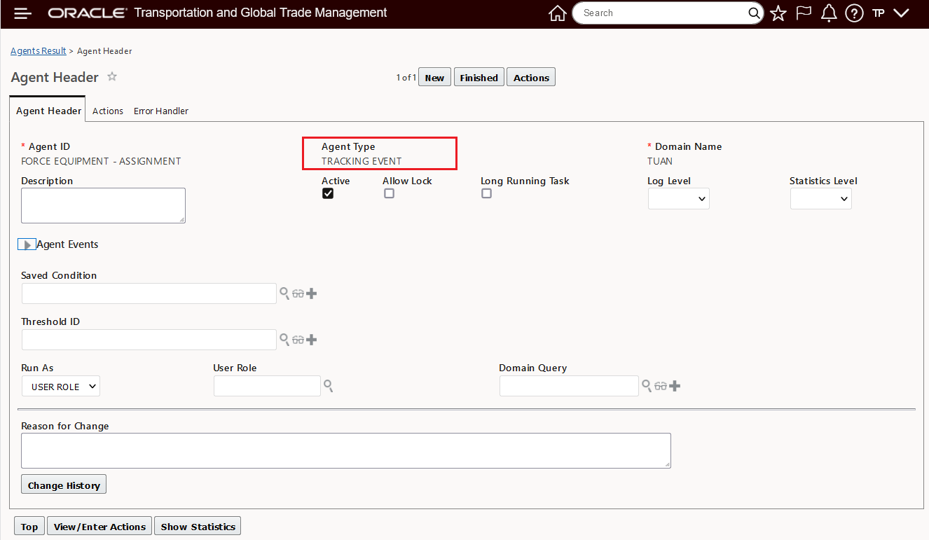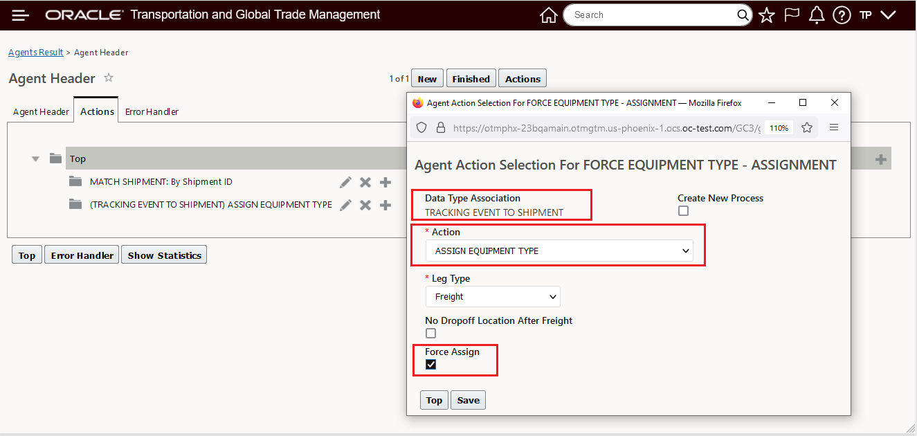 This feature provides you with the option of running the Force Equipment Type Assignment action as an Agent Action. Previously, the option to Force Assign the Equipment Type was only available as a Shipment Web action. The Force option on the Equipment Type Assignment Agent Action allows you to automate the process of force assigning your Equipment Type assignments.