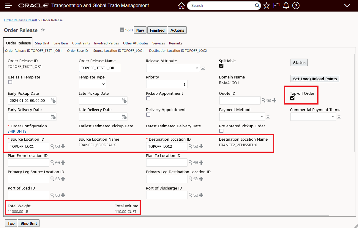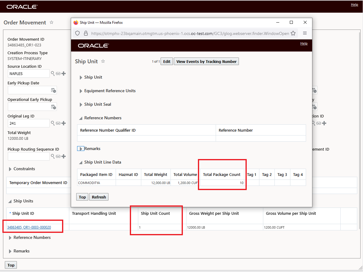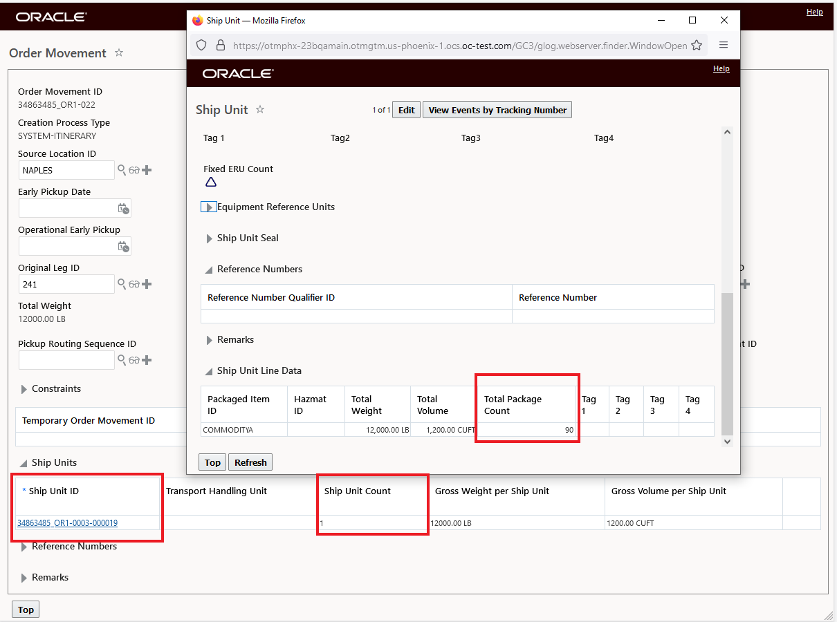 In the example below, the same orders will be used, but in this case the ship unit quantities will be based on the Stop Debrief ship unit counts entered vs the Planned Picked Up and Planned Received quantities. To enable this setup/scenario the property - glog.business.secondarycharge.ruleType.stop.considerDebriefsForScCharge - must be set to true, when set to true the entered debrief records will be used when creating the Secondary Charge Shipments.