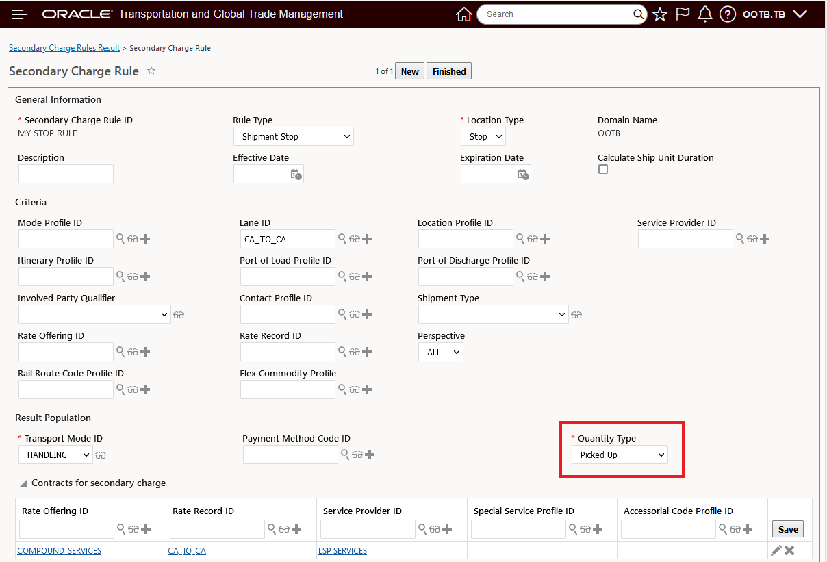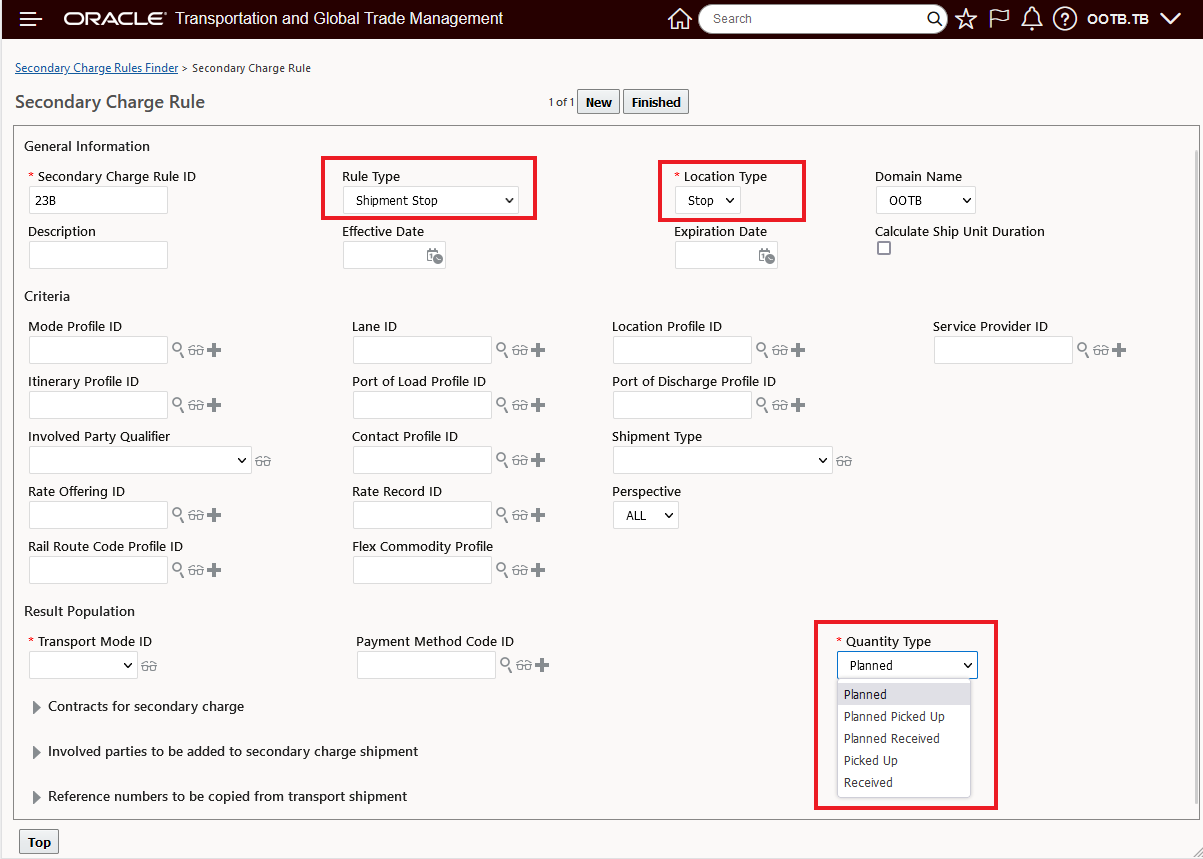 This feature improves the Secondary Charge Shipment Rule UI and logic used when generating Secondary Charge Shipments based on Shipment Stops and Ship Unit Counts. Specifically, this feature clears up a UI issue related to providing the correct Quantity Type values based on selected options for Rule Type and Location Type. The feature also provides you with two additional Quantity Type options (Picked Up and Received) and the related logic which will allow you to use your Debrief stop level ship unit counts (actuals) in the cost calculation of your shipment stop level secondary charge shipments.