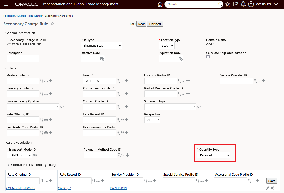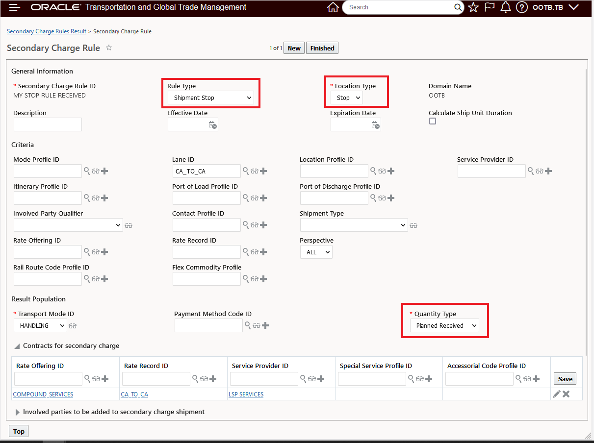 In the example below, the Secondary Charge Rule for Quantity Type Planned Received is modified so that only the 90210 Los Angeles stop location is considered for having a Secondary Charge Shipment generated. .