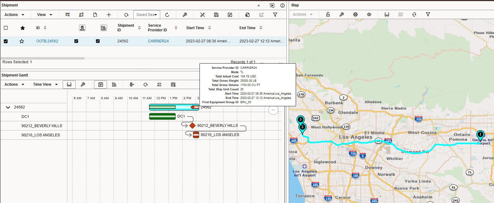 The shipment used in this example is shown below. The shipment is a three stop shipment starting at DC1 where 25 ship units are picked up, with subsequent deliveries in Beverly Hills and Los Angeles - so the lane CA TO CA (California to California) used in the Secondary Charge Rules covers all the stop activity for this shipment.