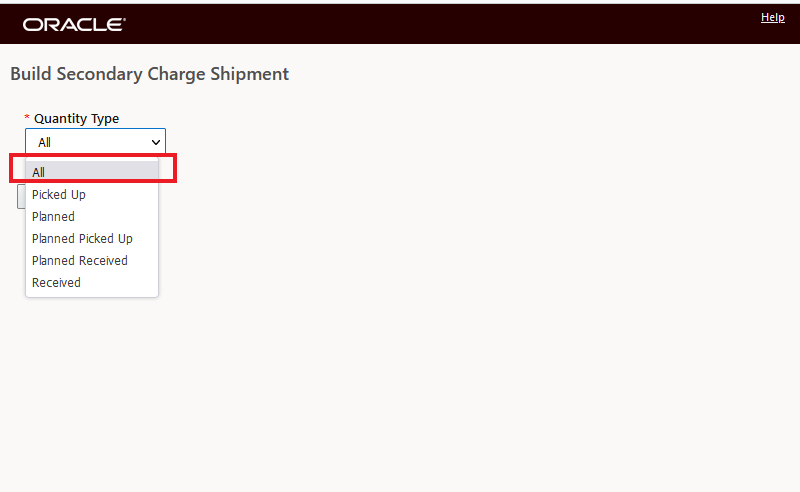 For this example, the Quantity Type selected is All - you can choose to generate secondary charge shipments for any one of the Quantity Type options listed.