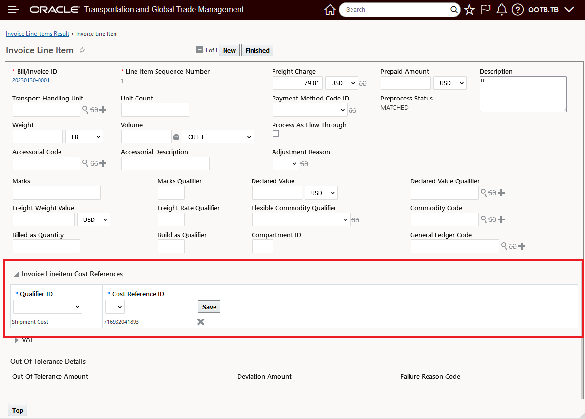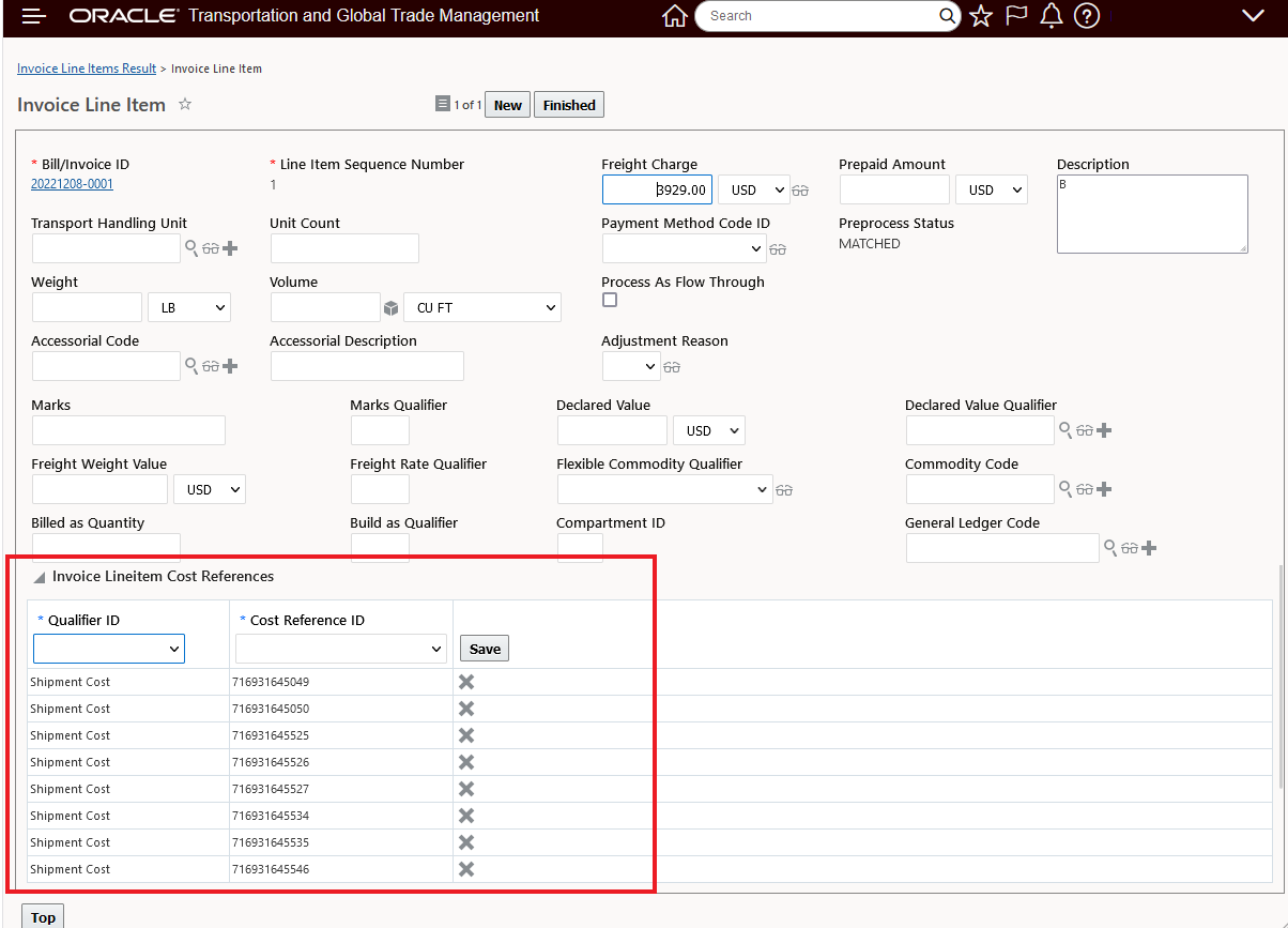 In the example below, the Created Invoice for the Shipment shows the Shipment Cost Reference in the Invoice Line Item Cost References grid.