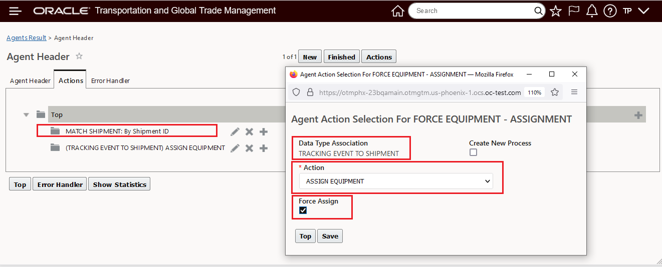 This feature provides you with the option of running the Force Equipment Assignment action as an Agent Action. Previously, the option to Force Assign the Equipment was only available as a Shipment Web action. The Force option on the Equipment Assignment Agent Action allows you to automate the process of force assigning your Equipment assignments.