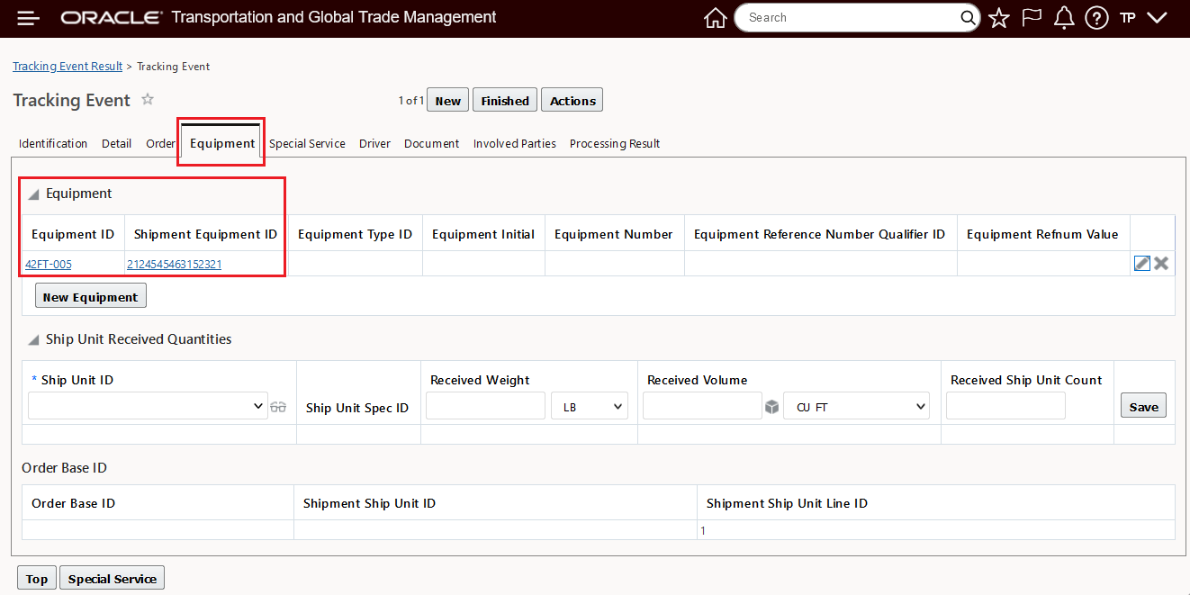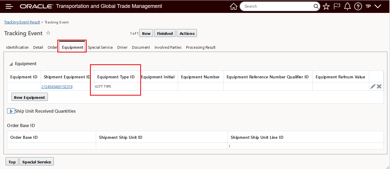 Using the Agent above, when the Tracking Event below is processed, the shipment is matched, and the Equipment Type (42FT TYPE) is assigned to the shipment.