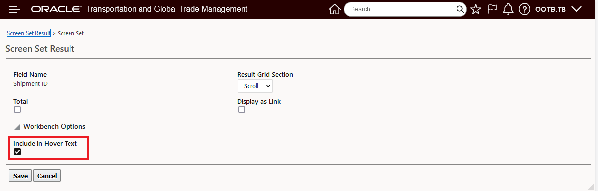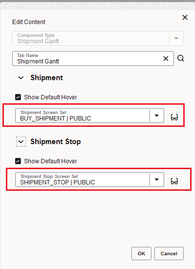 The Shipment Gantt default configuration is shown below. In this setup, the default Public Screen Sets for both the Shipment and Shipment Stop are used to configure the Hover Text. In this specific setup, the setup is redundant since the option to Show Default Hover and the selected Screen Set to use will use the same Public Screen Set - BUY_SHIPMENT. The option to Show Default Hover comes into play when you want the Hover Text to include both the fields configured for Hover Text in the Public Screen Set plus the fields configure in your configured Screen Set.