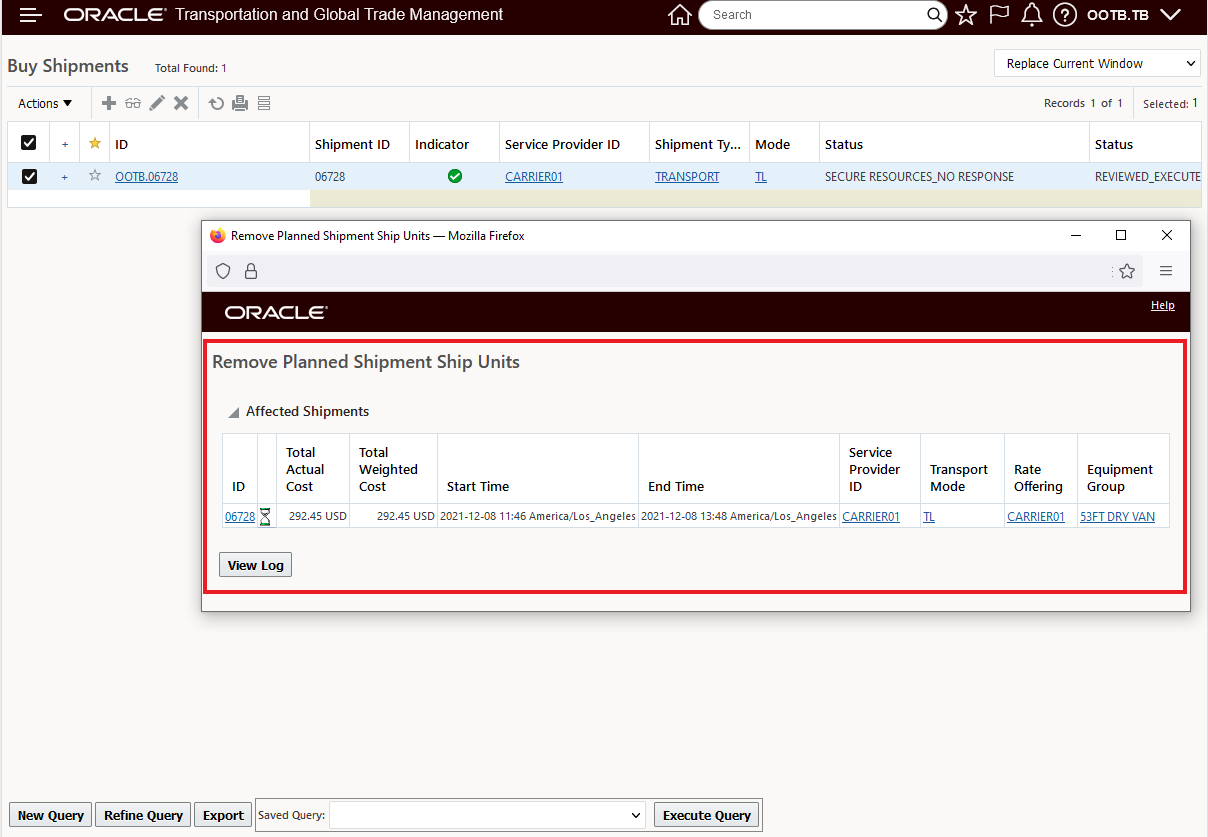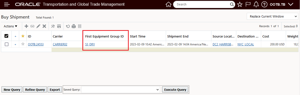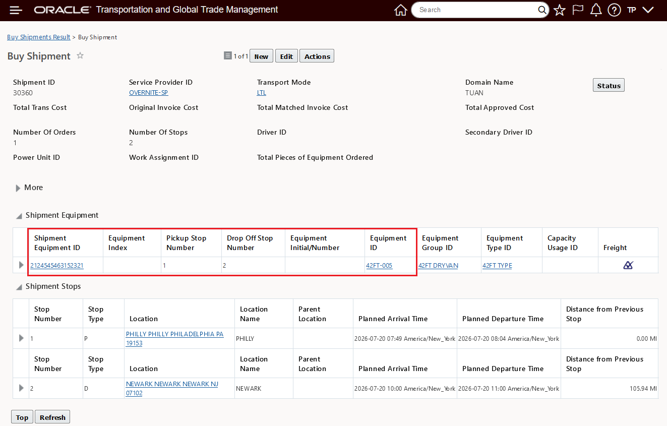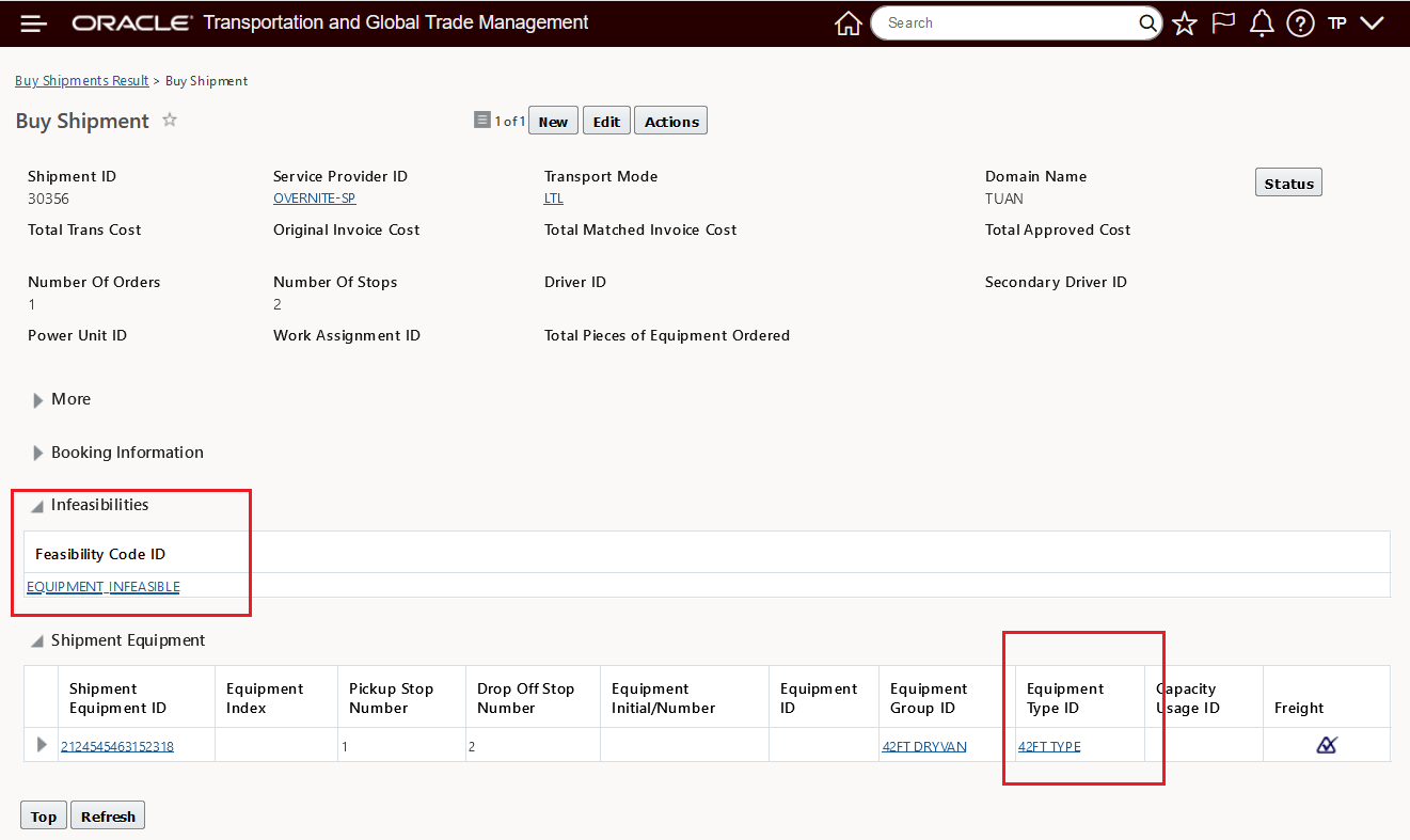 The result of the Force Assign Equipment Type is below, in this case the Force assignment was required since the shipment is infeasible - but correctly assigned to the desired 42FT TYPE equipment type.