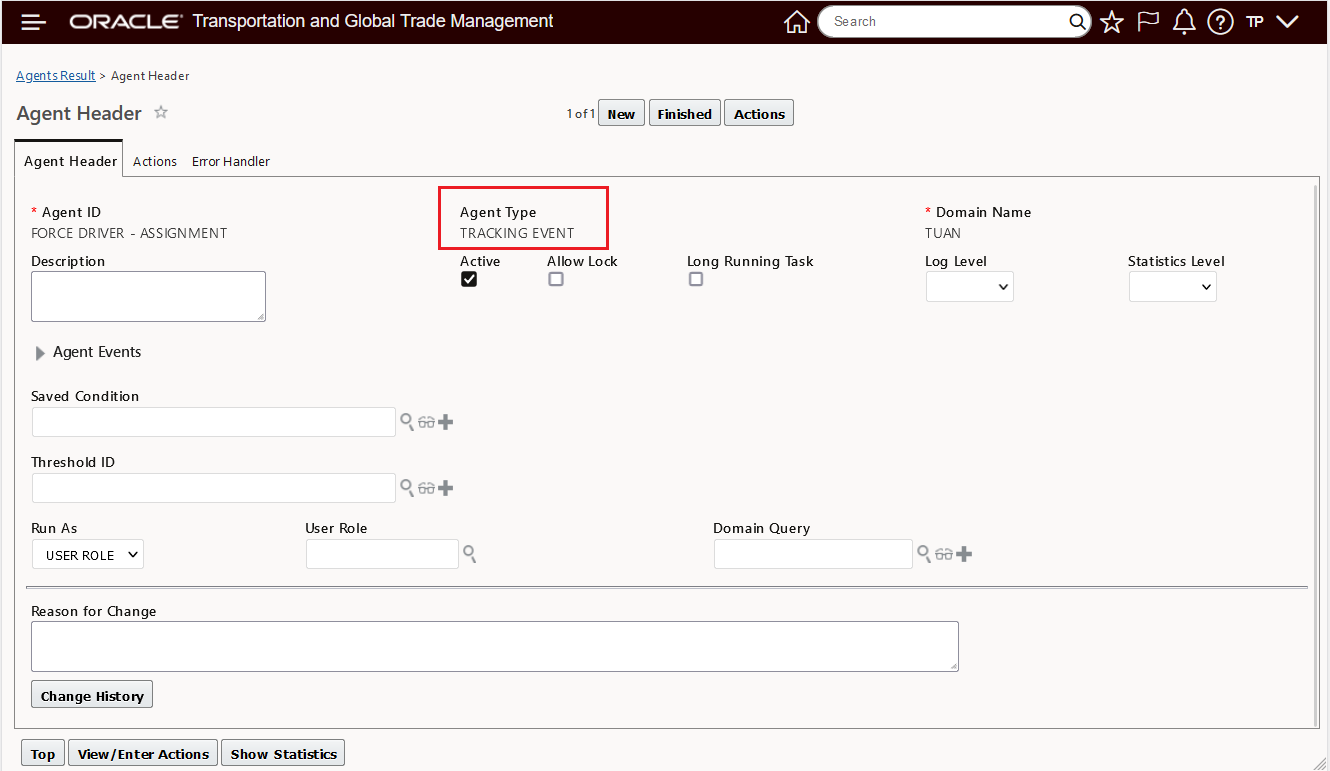 This feature adds the option of running the Force Driver Assignment action as an Agent Action. Previously the Force Driver Assignment was only available as a Shipment Web action.
