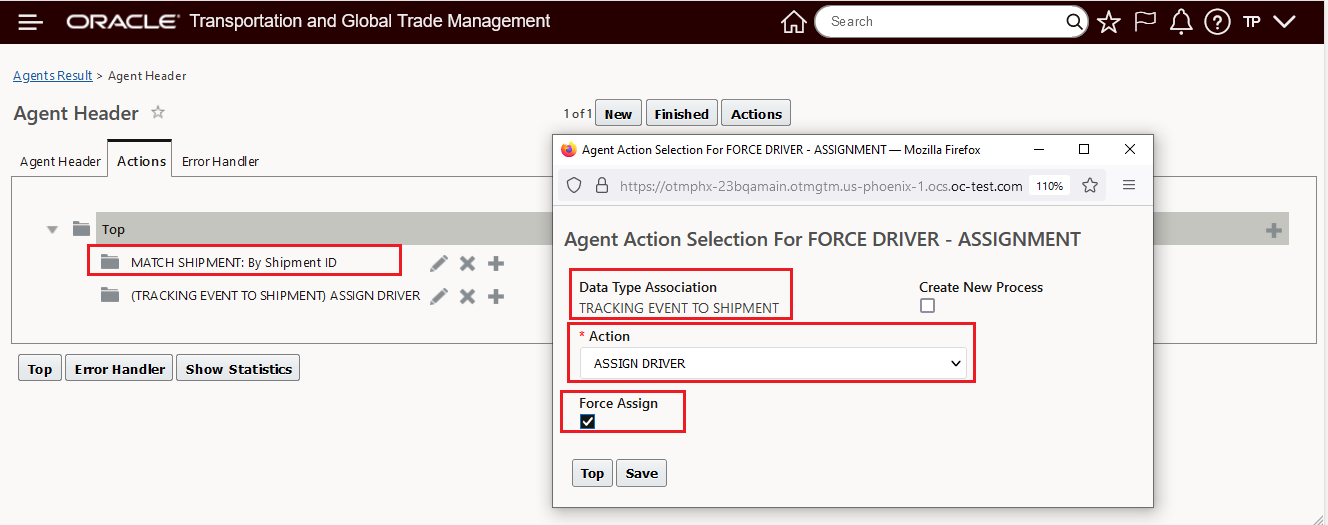 NOTE: The Data Type Association is Tracking Event to Shipment, the selected Action is Assign Driver and the new option to Force Assign is checked.