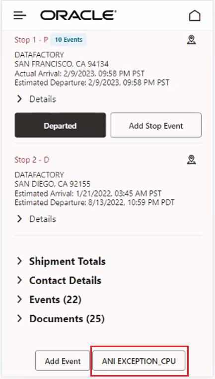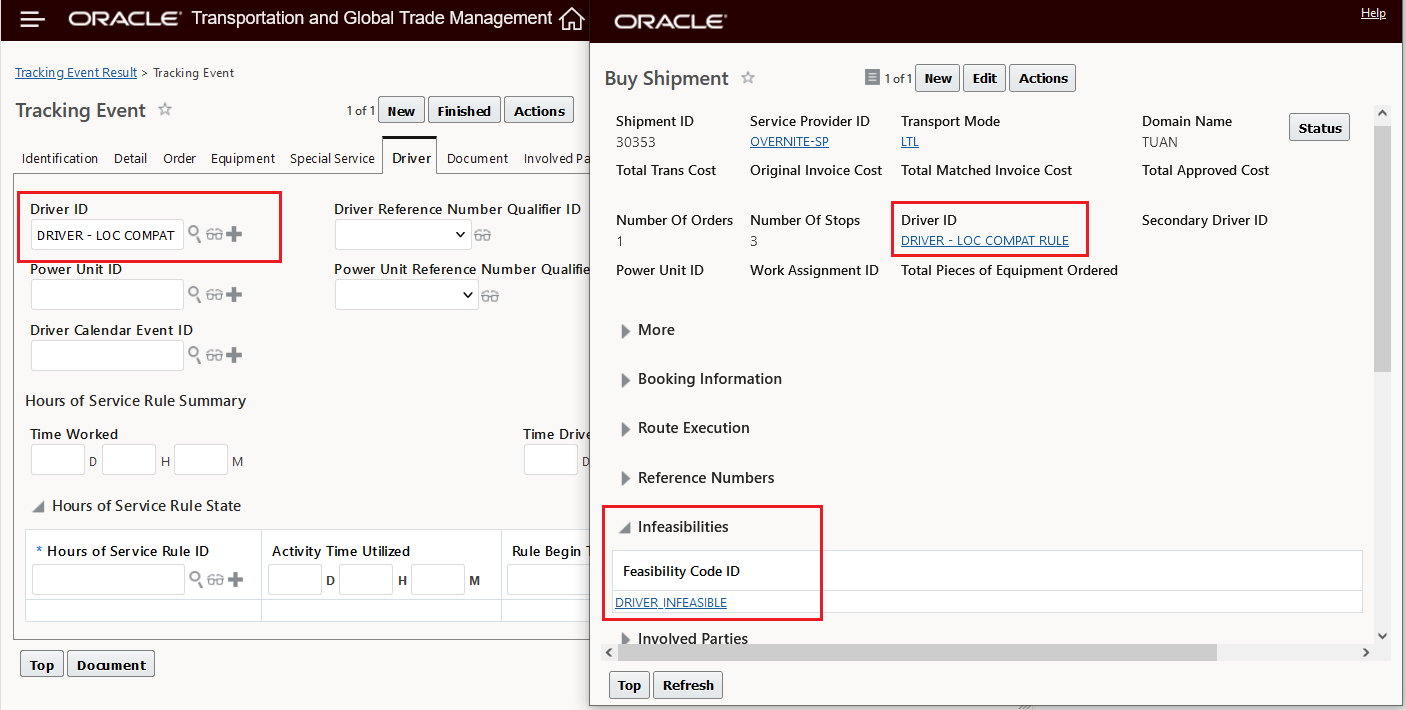 NOTE: The Driver (DRIVER-LOC COMPAT RULE) is assigned from the Tracking Event via the Force Assigned action - and the Force was necessary since the shipment is DRIVER INFEASIBLE after the assignment.