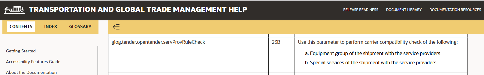 - Doc ID 796594.1: Oracle Transportation and Global Trade Management Documentation and Training Resources. Describes the published documentation available. Use this document to ensure that you leverage all existing resources to learn about, install, implement, and use this product.