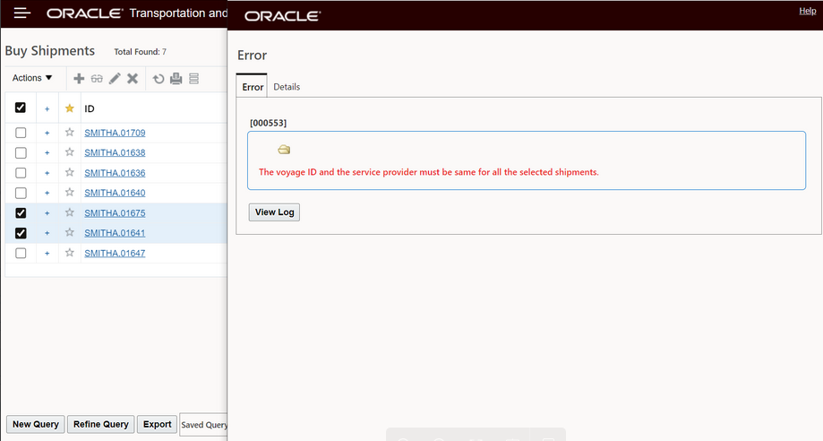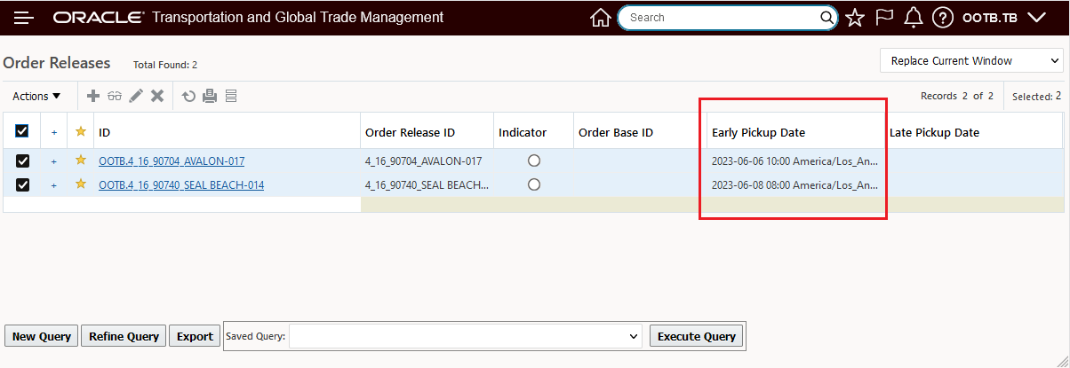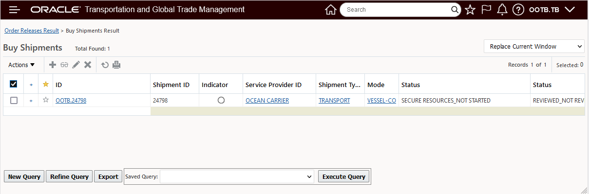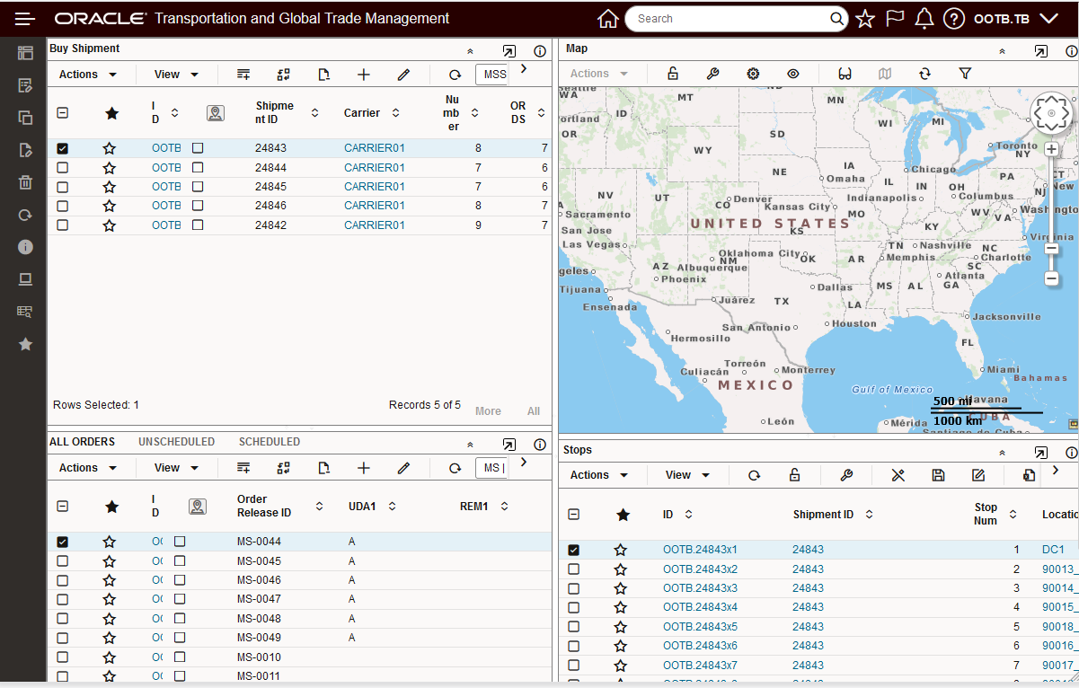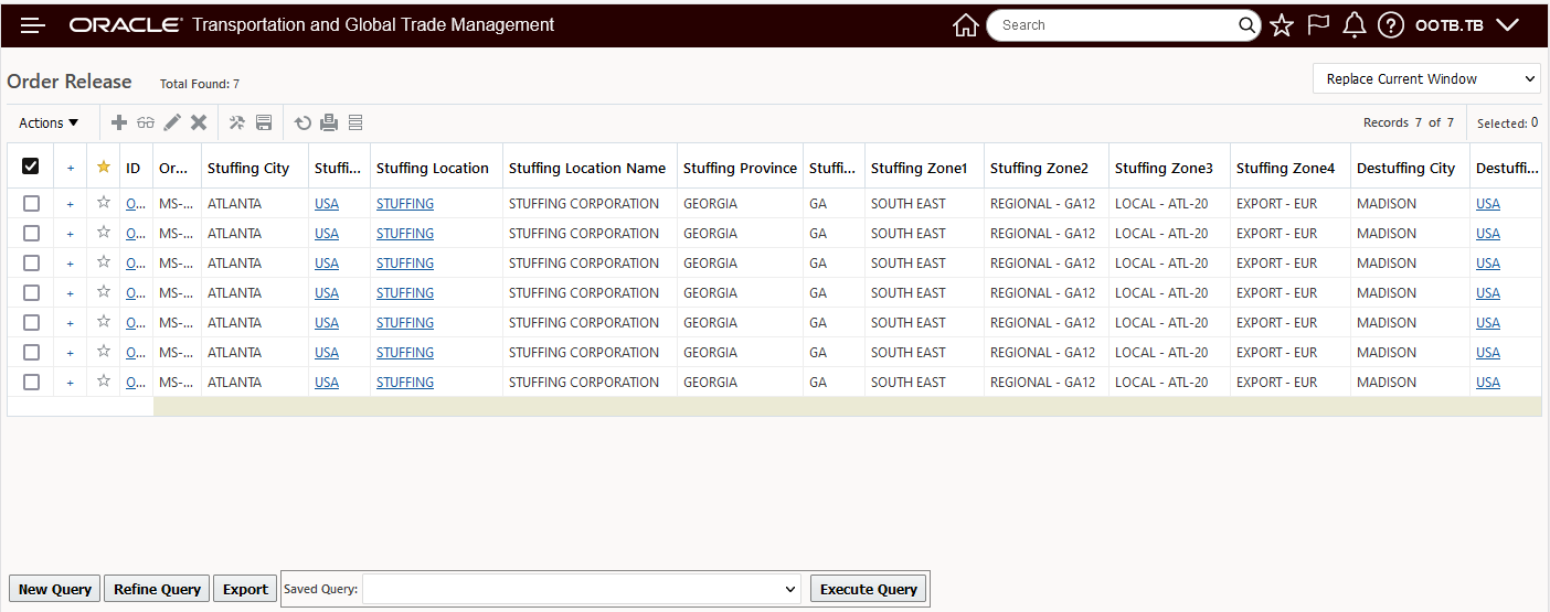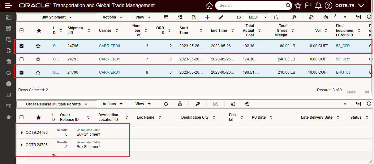 In the example below, two Parent shipment records are selected, with this feature configured, the eight related Detailed Order Release records are displayed - grouped by their Parent records as shown below.