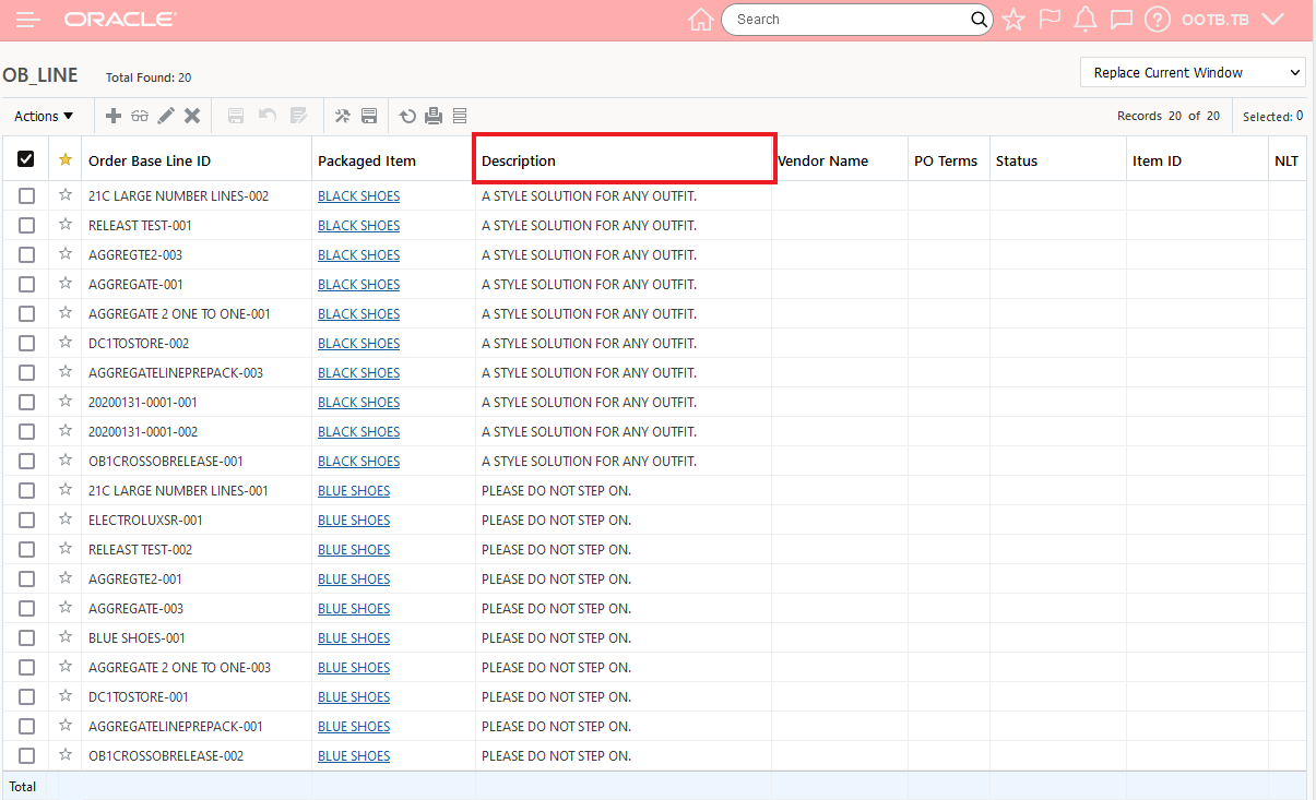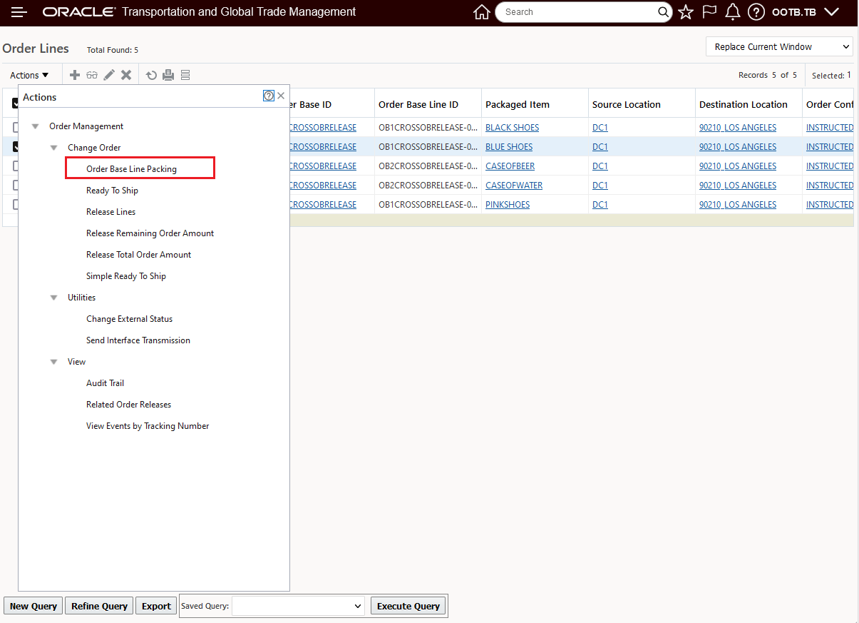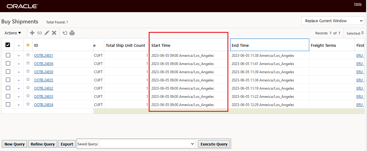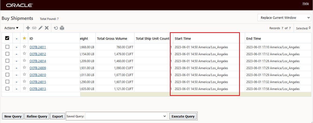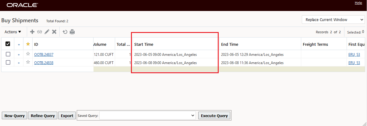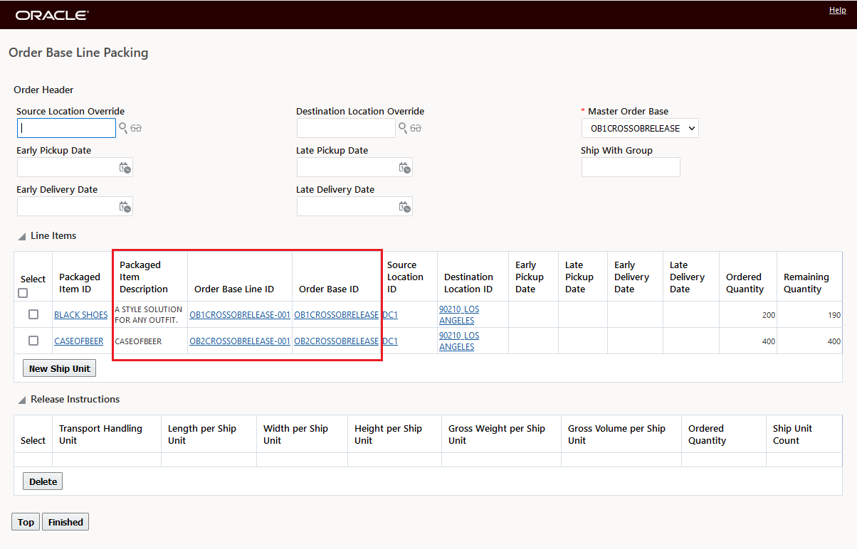 In the example below, two Parent shipment records are selected, with this feature configured, the eight related Detailed Order Release records are displayed - grouped by their Parent records as shown below.