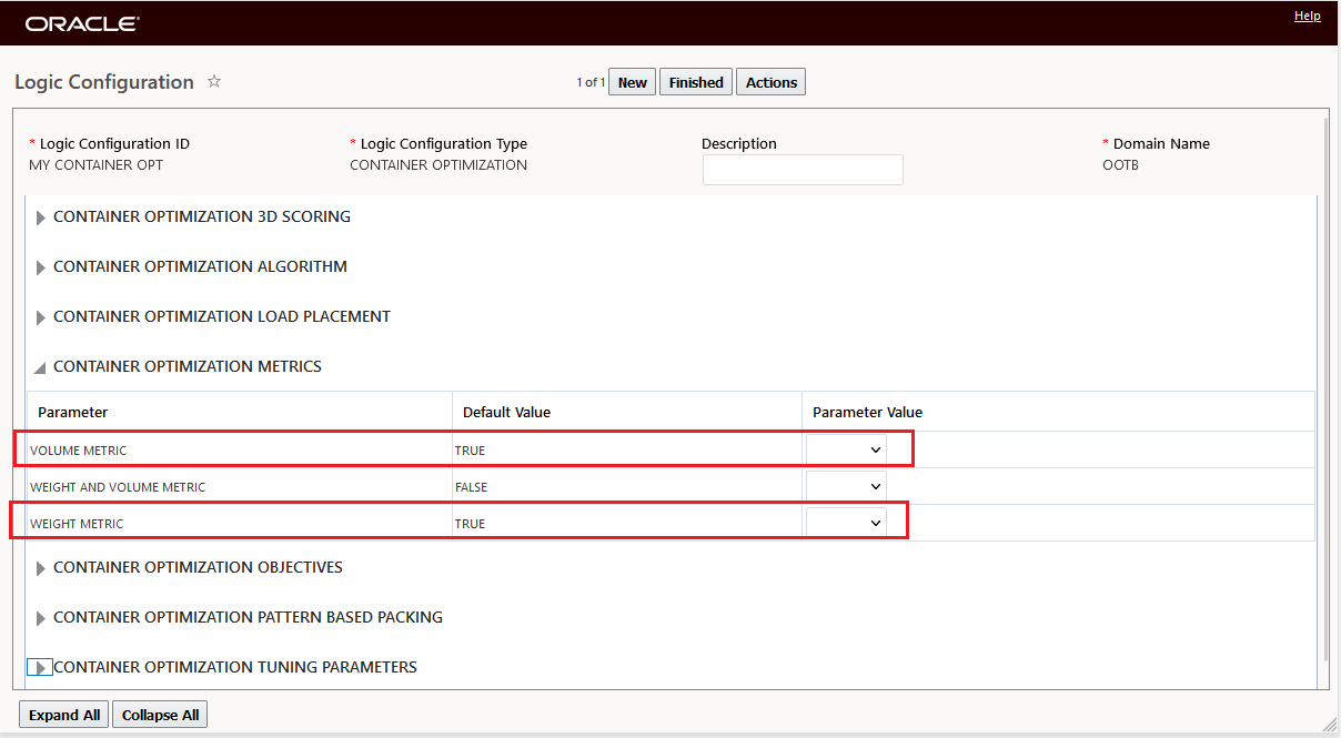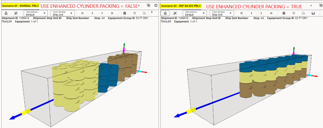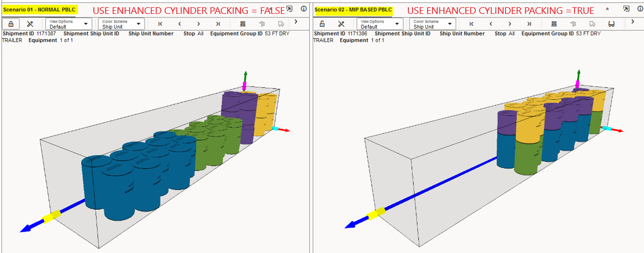 This feature provides a consistent view to the most utilized metric in situations where the two Logic Configuration Container Optimization Metrics for Volume and Weight are set to True and there is no cost difference to guide the most utilized selection.