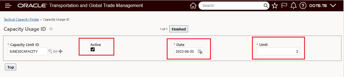 After setting up the Capacity Limit, the remaining items for defining the Tactical Capacity are checking the Active check box, specifying the Date for the capacity - in this example June 30th 2023 - and then defining the Limit, in this example 3.