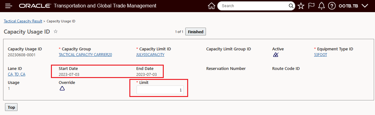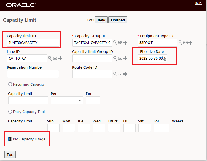 - Create a Capacity Limit record for the date your Tactical Capacity is being defined. Much of the information on the Capacity Limit will rely on base data defined previously - like Capacity Group, Equipment Type and Lane. The Tactical Capacity items on your Capacity Limit entry will be the Capacity Limit ID for this Tactical Capacity entry, the Effective Date for the Capacity Limit, and for Tactical Capacity, you will create your Capacity Limit record selecting the No Capacity Limit Usage option.