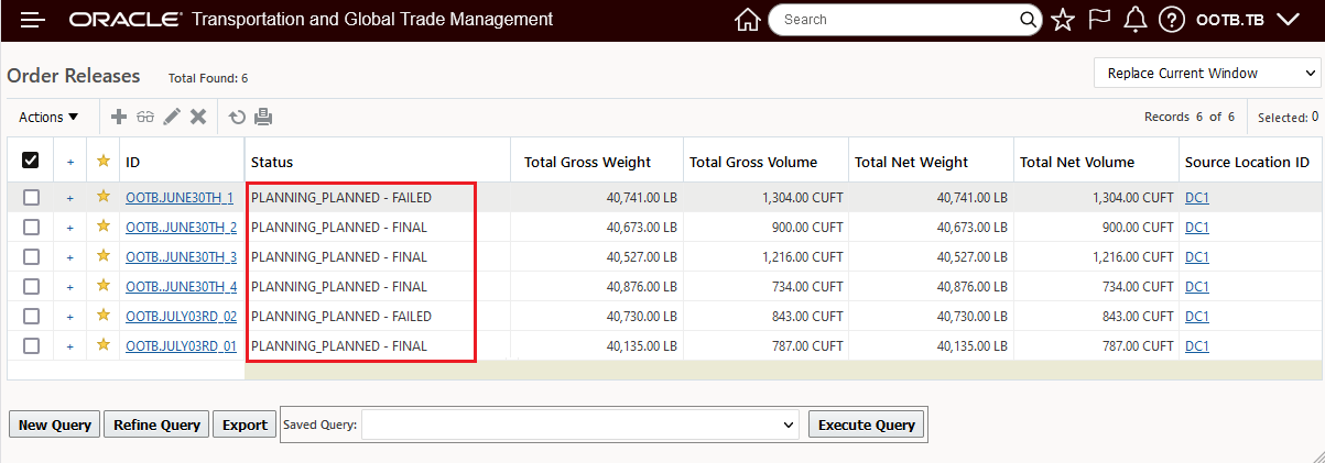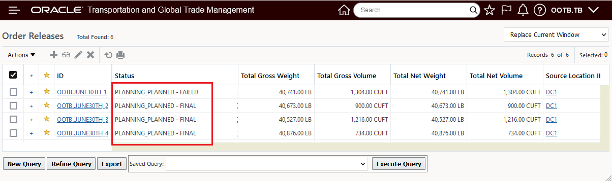 The result of the Tactical Capacity setup above is that Service Provider Carrier20 has 3 53 Foot Equipment on the CA_to_CA lane for June 30th. Given the four orders below that must ship on June 30th each requiring their own shipment - only 3 of the 4 orders are planned - as expected.