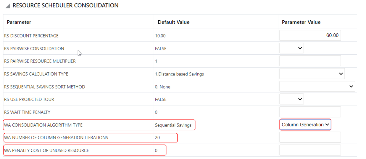 To take advantage of this feature the parameter WA CONSOLIDATION ALGORITHM TYPE in the RESOURCE SCHEDULER CONSOLIDATION section of the Resource Schedule Logic Configuration should be set to the Column Generation option. The default is set to the current Sequential Savings option. You may also want to adjust the WA NUMBER OF COLUMN GENERATION ITERATIONS - this parameters defines the number of iterations to solve the problem when using the Column Generation algorithm. This parameter can be used to help reduce the run time of the algorithm. The parameter WA PENALTY COST OF UNUSED RESOURCE can be used penalize the cost of unused resources. If you want all the resources to be used for more balanced workload, then this needs to be set to a high value.
