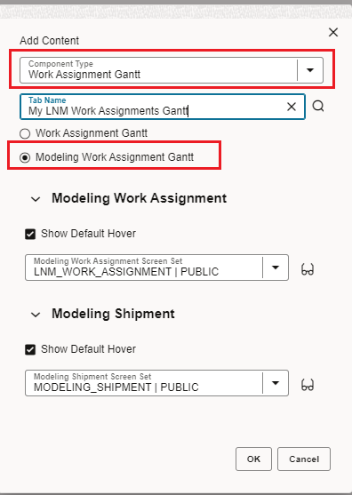 The configuration for displaying Modeling Work Assignments (or Work Assignments) is handled in the configuration of the Work Assignment Gantt. When you configure the Work Assignment Gantt, you now have the option to use the Gantt for Work Assignments (Work Assignment Gantt option) which is the original usage or you can select the Modeling Work Assignment Gantt option to have Work Assignment Gantt display Modeling Work Assignments..