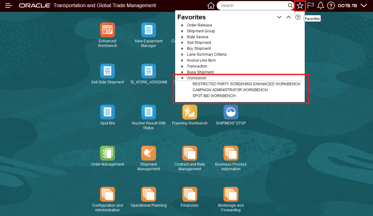 In the example below the Restricted Party Screening Enhanced Workbench has been selected as a Favorite, this is accomplished by selecting the Favorites star icon as shown.