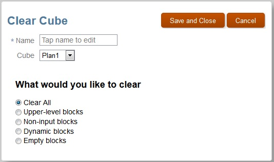 A new action menu in the Console allows customers to clear specific areas within both input and reporting cubes. For ASO reporting cubes, a partial clear allows the use of MDX expressions to identify areas of the cube to clear. Clear Cube jobs can be scheduled as jobs using the job scheduler.