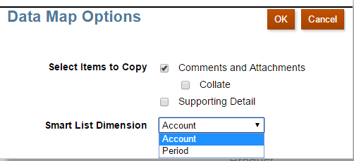 When defining data maps, the designer can pick any of the dense dimensions with Smart List associated to be mapped against a dimension in the target cube.