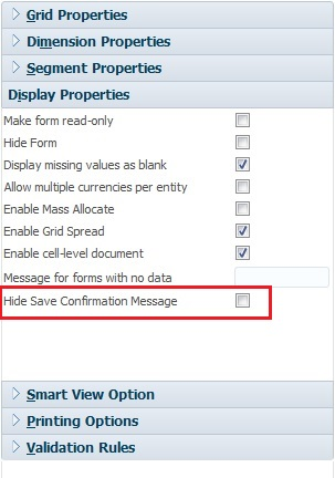 Form designers can now prevent the form save confirmation message from being displayed to users by specifying an option in form design.