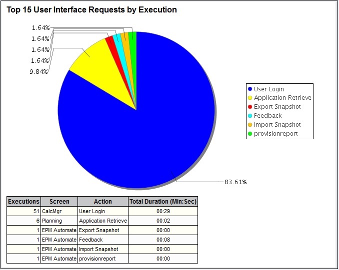 The Activity Report now includes Financial Reporting report generation activities in the list of activities considered for inclusion in the section titled Top 30 Worst Performing User Interface Actions over 10 Seconds. The report identifies the long running user action and the corresponding report object to help you fine tune your reports.