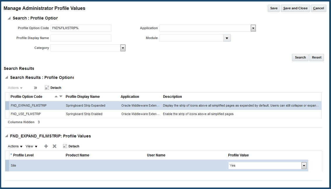 You can now control the configuration of the springboard strip that appears above all simplified pages using the Manage Administrator Profile Values task in the Setup and Maintenance work area. Simply set the Springboard Strip Enabled profile option to Yes, and that will enable you to use the springboard strip. To display the strip as expanded by default, set the Springboard Strip Expanded profile option to Yes.