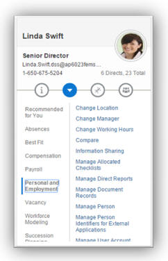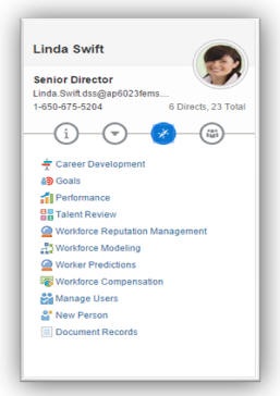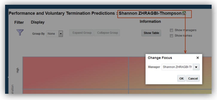 Workforce Predictions is enhanced to allow HR Specialists to view teams to whom they have responsibility. If the HR Specialist is a manager, then their team initially displays, however, they can use the change focus icon to select another manager. If they’re not a manager, then the change focus dialog automatically displays prompting the user to select a manager.
