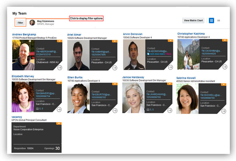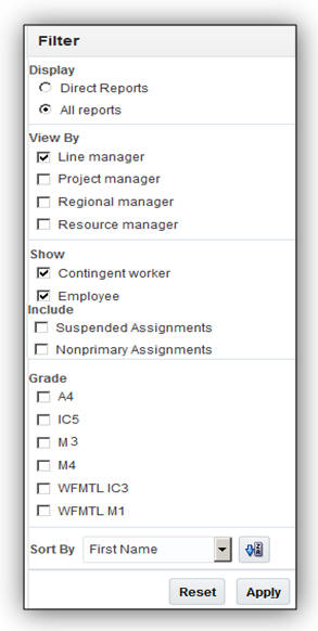Oracle Fusion Workforce Predictions allows the user to view teams to whom they have responsibility. This feature allows HR Specialists to select any manager they have responsibility for and view the predictions for that manager’s team.